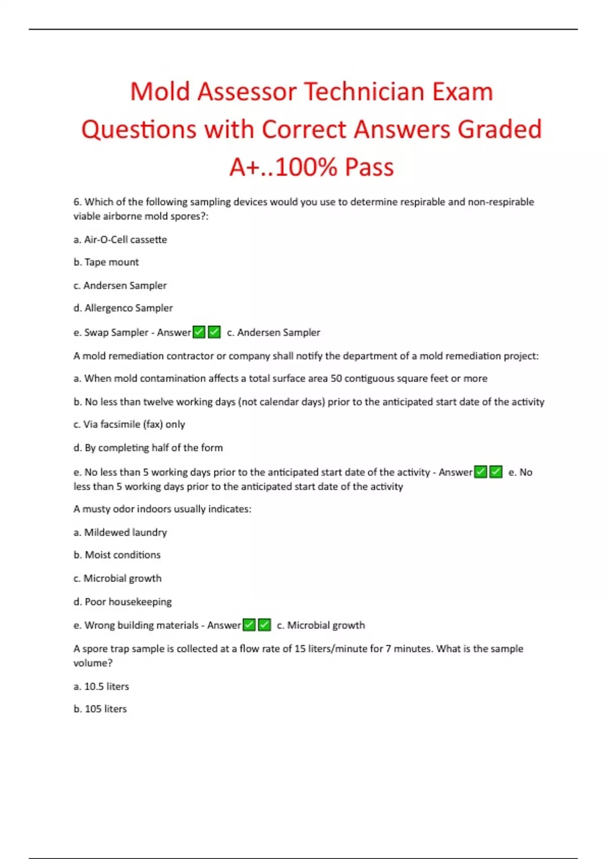 Mold Assessor Technician Exam Questions with Correct Answers Graded A+..100% Pass 6. Which of the following sampling devices would you use to determine respirable and non-respirable viable airborne mold spores?: a. Air-O-Cell cassette b. Tape mount c. Andersen Sampler d. Allergenco Sampler e. Swap Sampler - Answer c. Andersen Sampler A mold remediation contractor or company shall notify the department of a mold remediation project: a. When mold contamination affects a total surface area 50 contiguous square feet or more b. No less than twelve working days (not calendar days) prior to the anticipated start date of the activity c. Via facsimile (fax) only d. By completing half of the form e. No less than 5 working days prior to the anticipated start date of the activity - Answer e. No less than 5 working days prior to the anticipated start date of the activity A musty odor indoors usually indicates: a. Mildewed laundry b. Moist conditions c. Microbial growth d. Poor housekeeping e. Wrong building materials - Answer c. Microbial growth A spore trap sample is collected at a flow rate of 15 liters/minute for 7 minutes. What is the sample volume? a. 10.5 liters b. 105 liters