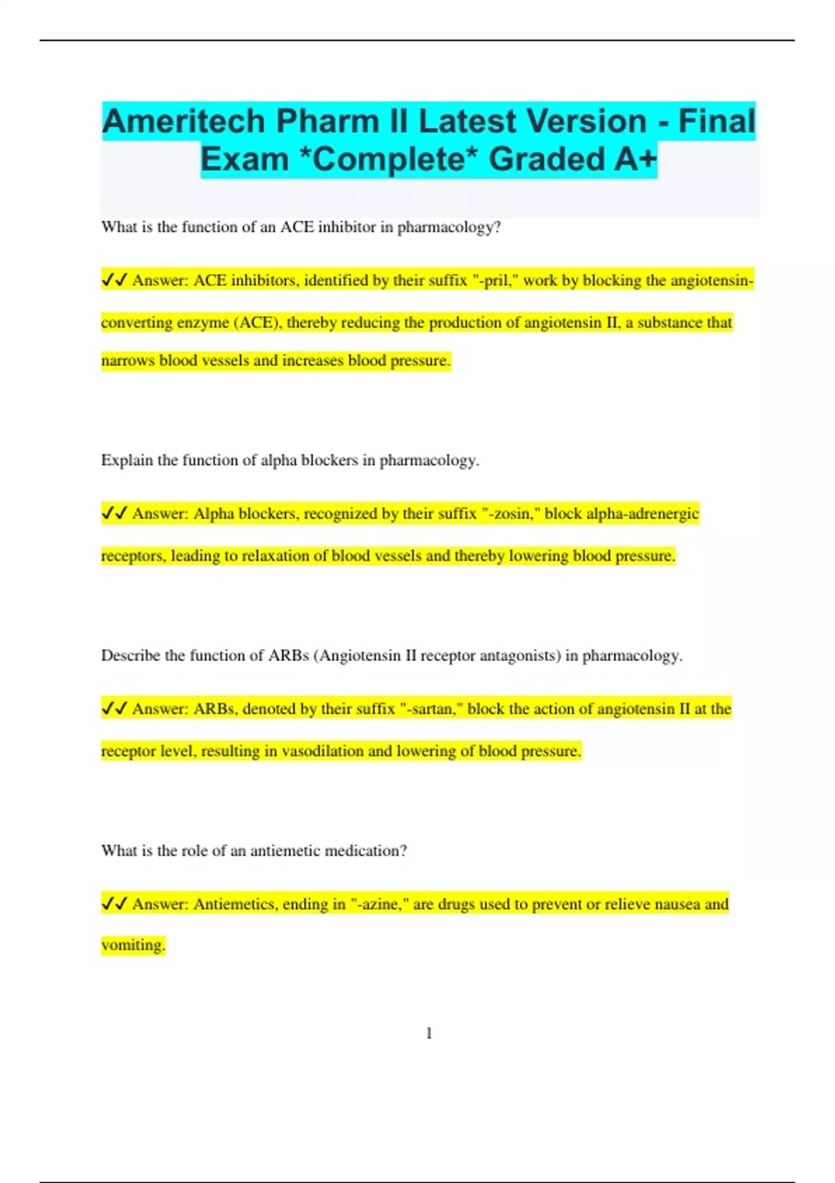 Ameritech Pharm II Latest Version - Final Exam *Complete* Graded A+ What is the function of an ACE inhibitor in pharmacology? Answer: ACE inhibitors, identified by their suffix "-pril," work by blocking the angiotensin- converting enzyme (ACE), thereby reducing the production of angiotensin II, a substance that narrows blood vessels and increases blood pressure. Explain the function of alpha blockers in pharmacology. Answer: Alpha blockers, recognized by their suffix "-zosin," block alpha-adrenergic receptors, leading to relaxation of blood vessels and thereby lowering blood pressure. Describe the function of ARBs (Angiotensin II receptor antagonists) in pharmacology. Answer: ARBs, denoted by their suffix "-sartan," block the action of angiotensin II at the receptor level, resulting in vasodilation and lowering of blood pressure. What is the role of an antiemetic medication? Answer: Antiemetics, ending in "-azine," are drugs used to prevent or relieve nausea and vomiting. 2 Define the function of an antihistamine in pharmacology. Answer: Antihistamines, with the suffix "-zine," block the action of histamine, a substance involved in allergic reactions, thereby alleviating symptoms like itching and sneezing. What is the purpose of an antilipidemic medication? Answer: Antilipidemics, ending in "-statin," are drugs used to lower lipid levels in the blood, such as cholesterol and triglycerides. Describe the function of an antiulcer medication. Answer: Antiulcer medications, identified by their suffix "-dine" (H2 blockers), reduce stomach acid production to treat and prevent ulcers in the stomach and duodenum. What is the role of an antiviral medication? Answer: Antivirals, ending in "-vir," are drugs used to treat viral infections by inhibiting the replication of viruses in the body. Explain the function of a beta blocker in pharmacology. 3 Answer: Beta blockers, recognized by their suffix "-olol," block the action of adrenaline (epinephrine) and noradrenaline (norepinephrine), thereby reducing heart rate and blood pressure. Describe the role of a bronchodilator medication. Answer: Bronchodilators, ending in "-phylline," relax the smooth muscles of the airways in the lungs, making it easier to breathe. What is the function of a calcium channel blocker in pharmacology? Answer: Calcium channel blockers, identified by their suffix "-dipine," prevent calcium from entering cells of the heart and