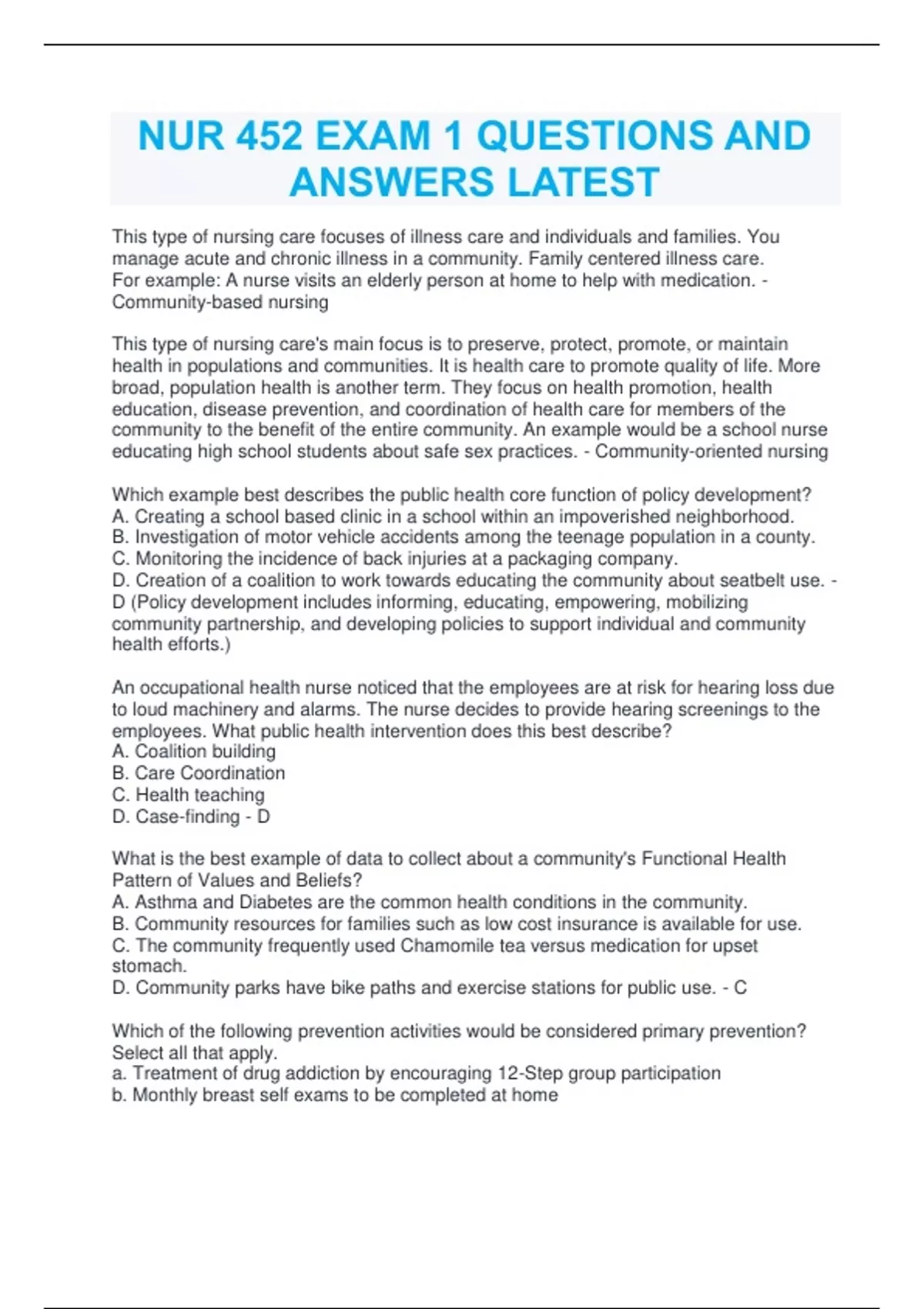 NUR 452 EXAM 1 QUESTIONS AND ANSWERS LATEST