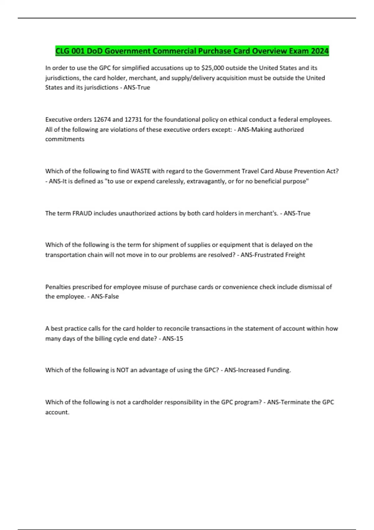 CLG 001 DoD Government Commercial Purchase Card Overview Exam 2024