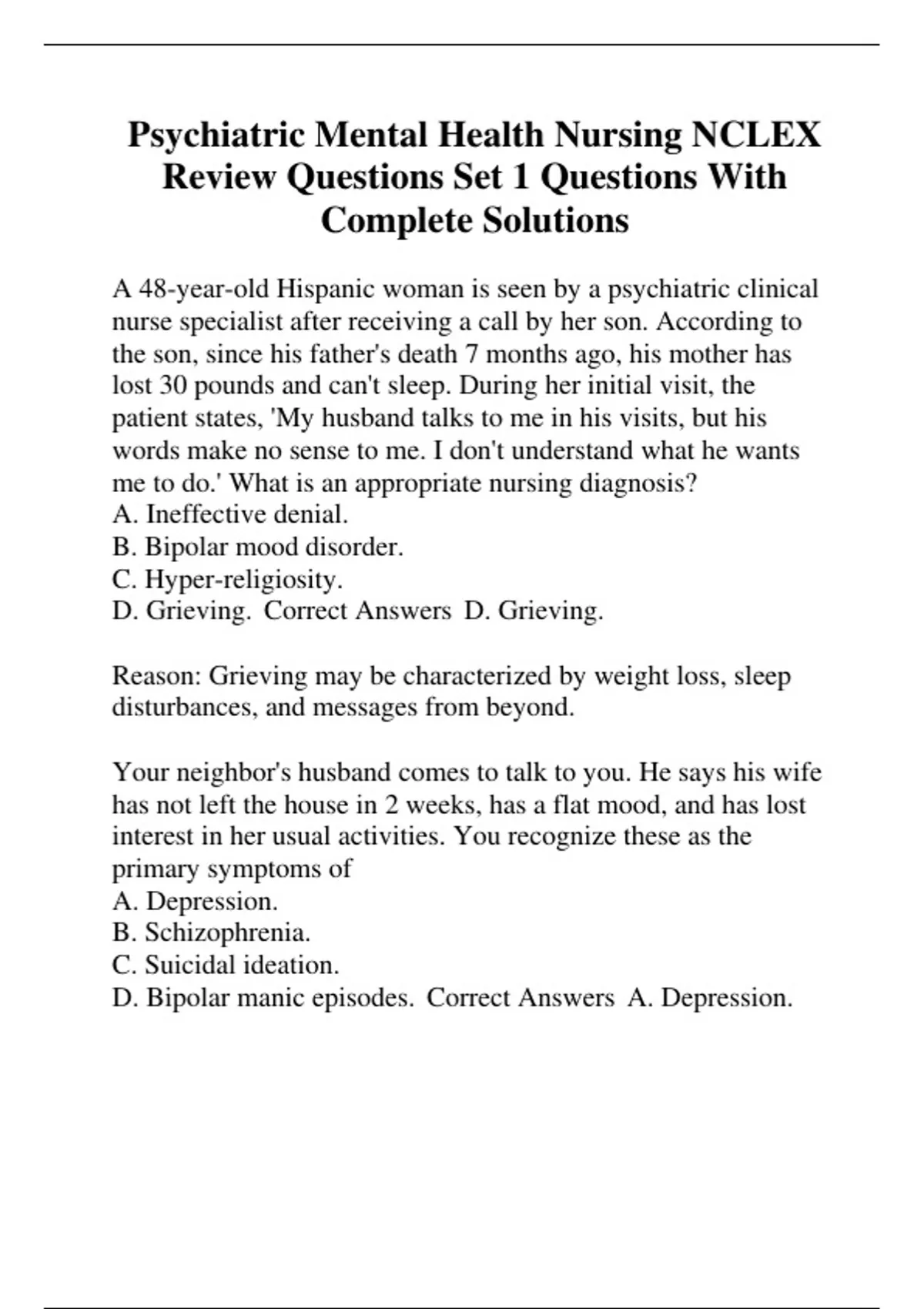 Psychiatric Mental Health Nursing NCLEX Review Questions Set 1 Questions With Complete Solutions