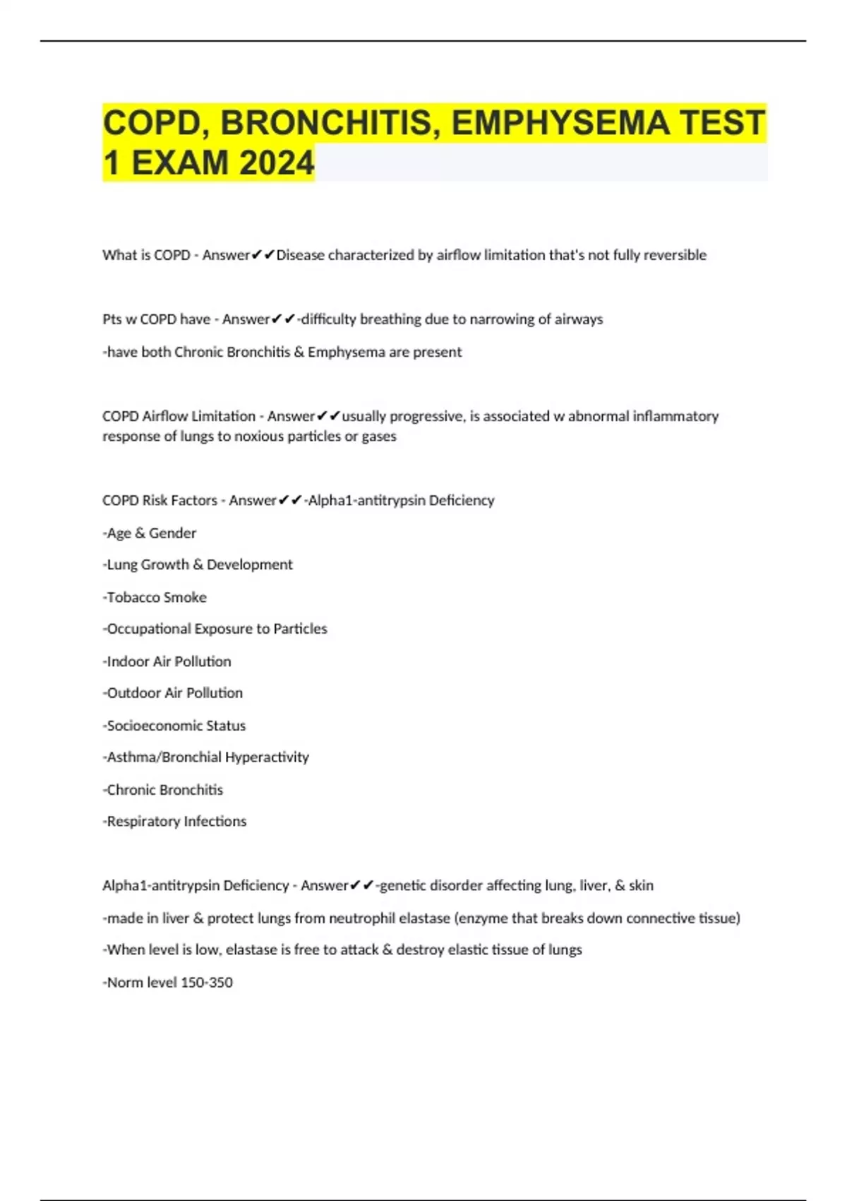 COPD, BRONCHITIS, EMPHYSEMA TEST 1 EXAM 2024