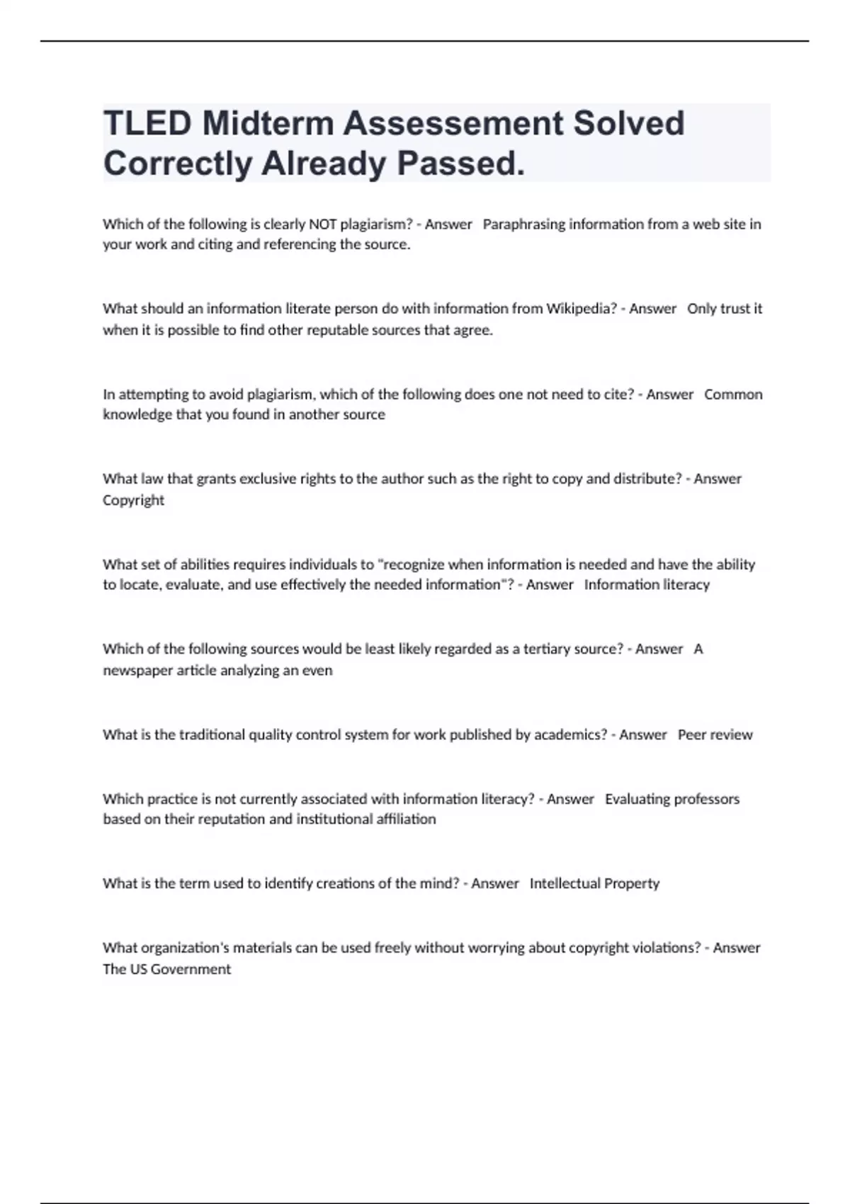 Which of the following is clearly NOT plagiarism? - Answer Paraphrasing information from a web site in your work and citing and referencing the source. What should an information literate person do with information from Wikipedia? - Answer Only trust it when it is possible to find other reputable sources that agree. In attempting to avoid plagiarism, which of the following does one not need to cite? - Answer Common knowledge that you found in another source What law that grants exclusive rights to the author such as the right to copy and distribute? - Answer Copyright What set of abilities requires individuals to "recognize when information is needed and have the ability to locate, evaluate, and use effectively the needed information"? - Answer Information literacy Which of the following sources would be least likely regarded as a tertiary source? - Answer A newspaper article analyzing an even What is the traditional quality control system for work published by academics? - Answer Peer review Which practice is not currently associated with information literacy? - Answer Evaluating professors based on their reputation and institutional affiliation What is the term used to identify creations of the mind? - Answer Intellectual Property What organization's materials can be used freely without worrying about copyright violations? - Answer The US Government