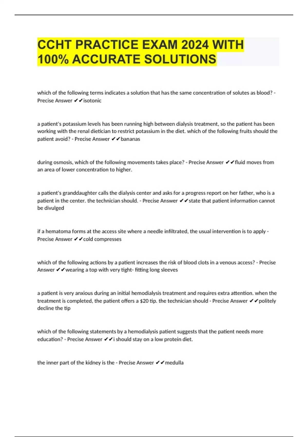 which of the following terms indicates a solution that has the same concentration of solutes as blood? - Precise Answer isotonic a patient's potassium levels has been running high between dialysis treatment, so the patient has been working with the renal dietician to restrict potassium in the diet. which of the following fruits should the patient avoid? - Precise Answer bananas during osmosis, which of the following movements takes place? - Precise Answer fluid moves from an area of lower concentration to higher. a patient's granddaughter calls the dialysis center and asks for a progress report on her father, who is a patient in the center. the technician should. - Precise Answer state that patient information cannot be divulged if a hematoma forms at the access site where a needle infiltrated, the usual intervention is to apply - Precise Answer cold compresses which of the following actions by a patient increases the risk of blood clots in a venous access? - Precise Answer wearing a top with very tight- fitting long sleeves a patient is very anxious during an initial hemodialysis treatment and requires extra attention. when the treatment is completed, the patient offers a $20 tip. the technician should - Precise Answer politely decline