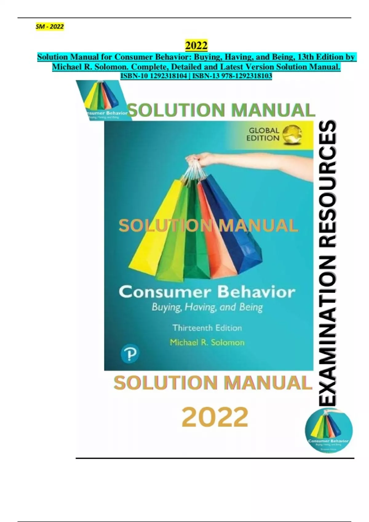 Exam Resources - SM for Consumer Behavior: Buying, Having, and Being, 13th Edition by Michael R. Solomon. Complete, Detailed and Latest Version Solution Manual. All Chapters (1-14) Included. #BuyingAndBeing #ConsumerWellBeing #ConsumerPerception #LearningMemory #MotivationAffect #SelfIdentity #PersonalityValues #PersuasiveCommunication #DecisionMaking #ProductUsage #GroupInfluences #SocialMediaInfluence #IncomeSocialClass #ConsumerCulture Buying, being, consumer, well-being, perception, learning, memory, motivation, affect, self, identity, personality, values, persuasive, communication, decision, making, product, usage, group, influences, social, media, income, class, culture. PART 1: FOUNDATIONS OF CONSUMER BEHAVIOR Chapter:1.Buying, Having, and Being: An Introduction to Consumer Behavior Chapter:2.Consumer and Social Well-Being PART 2: INTERNAL INFLUENCES ON CONSUMER BEHAVIOR Chapter:3.Perception Chapter:4.Learning and Memory Chapter:5.Motivation and Affect Chapter:6.The Self and Gender Identity Chapter:7.Personality, Lifestyles, and Values PART 3: CHOOSING AND USING PRODUCTS Chapter:8.Attitudes and Persuasive Communications Chapter:9.Decision Making Chapter:10.Buying, Using, and Disposing PART 4: CONSUMERS IN THEIR SOCIAL AND CULTURAL SETTINGS Chapter:11.Group Influences and Social Media Chapter:12.Income and Social Class Chapter:13.Subcultures Chapter:14.Culture Solution Manual for Consumer Behavior: Buying, Having, and Being, 13th Edition by Michael R. Solomon. Complete, Detailed and Latest Version Solution Manual. All Chapters (1-14) Included - ISBN- | ISBN-