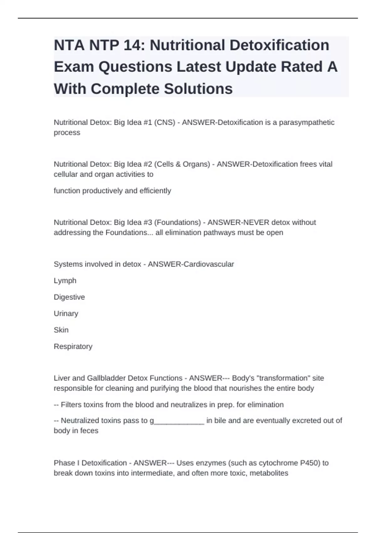 NTA NTP 14: Nutritional Detoxification Exam Questions Latest Update Rated A With Complete Solutions