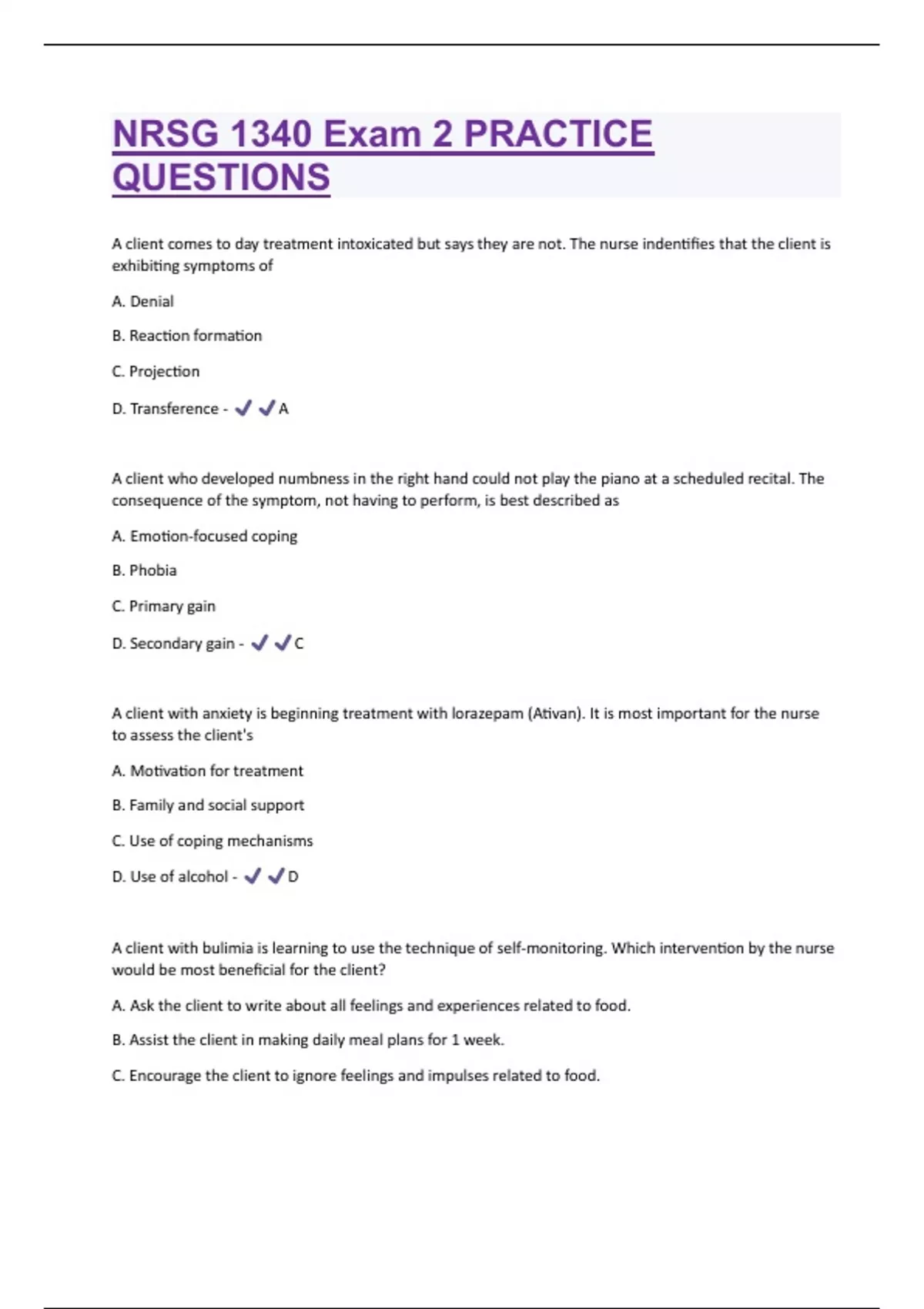 A client comes to day treatment intoxicated but says they are not. The nurse indentifies that the client is exhibiting symptoms of A. Denial B. Reaction formation C. Projection D. Transference - A A client who developed numbness in the right hand could not play the piano at a scheduled recital. The consequence of the symptom, not having to perform, is best described as A. Emotion-focused coping B. Phobia C. Primary gain D. Secondary gain - C A client with anxiety is beginning treatment with lorazepam (Ativan). It is most important for the nurse to assess the client's A. Motivation for treatment B. Family and social support C. Use of coping mechanisms D. Use of alcohol - D A client with bulimia is learning to use the technique of self-monitoring. Which intervention by the nurse would be most beneficial for the client? A. Ask the client to write about all feelings and experiences related to food. B. Assist the client in making daily meal plans for 1 week. C. Encourage the client to ignore feelings and impulses related to food.D. Teach the client about nutrition conent and calories of various foods. - A A client with GAD states, "I have learned that the best thing I can do is forget my worries." How would the nurse evaluate this statement? A. The client is developing insight. B. The client's coping skills have improved. C. The client needs encouragement to verbalize feelings. D. The client's treatment has been successful. - C A client with OCD is admitting to the hospital owing to ritualistic hand washing that occupies several hours each day. The skin on the client's hands is red and cracked, with evidence of minor bleeding. The goal for this client is A. Decreasing the time spent washing hands B. Eliminating the hand washing rituals C. Providing milder soap for handwashing D. Providing good skin care - A A client with somatic symptom disorder has been attending group therapy. Which statement indicates therapy is having a positive outcome for this client? A. "I feel better physically just from getting a chance to talk." B. "I haven't said much, but I get a lot from listening to others." C. "I shouldn't complain too much; my problems are not as bad as others." D. "The other people in this group have emotional problems." - A