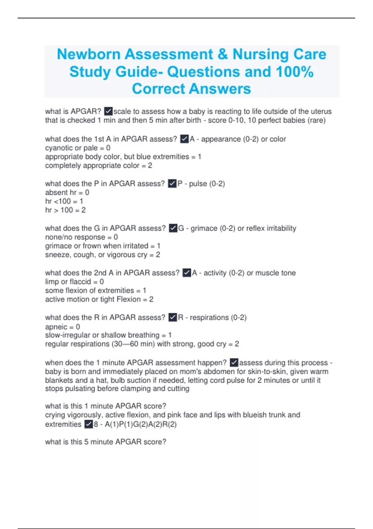 Newborn Assessment & Nursing Care Study Guide- Questions and 100% Correct Answers