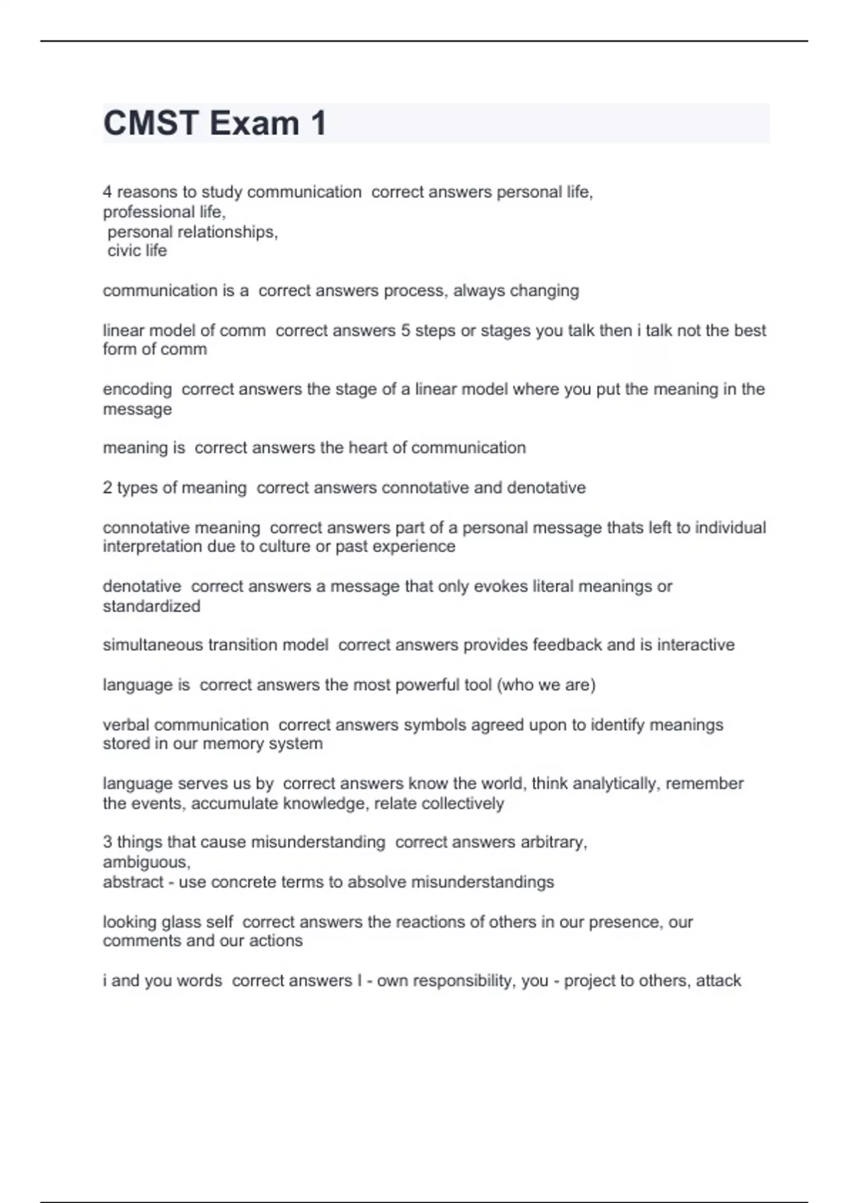 4 reasons to study communication correct answers personal life, professional life, personal relationships, civic life communication is a correct answers process, always changing linear model of comm correct answers 5 steps or stages you talk then i talk not the best form of comm encoding correct answers the stage of a linear model where you put the meaning in the message meaning is correct answers the heart of communication 2 types of meaning correct answers connotative and denotative connotative meaning correct answers part of a personal message thats left to individual interpretation due to culture or past experience denotative correct answers a message that only evokes literal meanings or standardized simultaneous transition model correct answers provides feedback and is interactive language is correct answers the most powerful tool (who we are) verbal communication correct answers symbols agreed upon to identify meanings stored in our memory system language serves us by correct answers know the world, think analytically, remember the events, accumulate knowledge, relate collectively 3 things that cause misunderstanding correct answers arbitrary, ambiguous, abstract - use concrete terms to absolve misunderstandings looking glass self correct answers the reactions of others in our presence, our comments and our actions i and you words correct answers I - own responsibility, you - project to others, attack