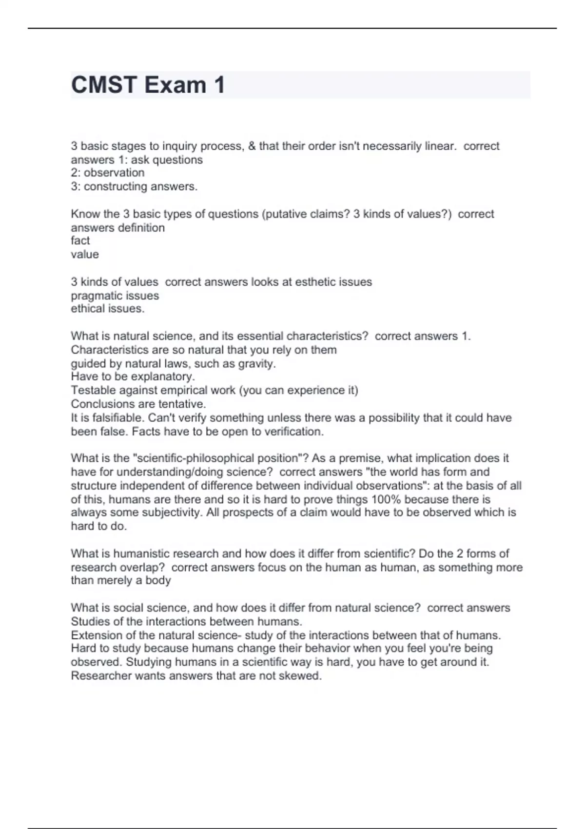 3 basic stages to inquiry process, & that their order isn't necessarily linear. correct answers 1: ask questions 2: observation 3: constructing answers. Know the 3 basic types of questions (putative claims? 3 kinds of values?) correct answers definition fact value 3 kinds of values correct answers looks at esthetic issues pragmatic issues ethical issues. What is natural science, and its essential characteristics? correct answers 1. Characteristics are so natural that you rely on them guided by natural laws, such as gravity. Have to be explanatory. Testable against empirical work (you can experience it) Conclusions are tentative. It is falsifiable. Can't verify something unless there was a possibility that it could have been false. Facts have to be open to verification. What is the "scientific-philosophical position"? As a premise, what implication does it have for understanding/doing science? correct answers "the world has form and structure independent of difference between individual observations": at the basis of all of this, humans are there and so it is hard to prove things 100% because there is always some subjectivity. All prospects of a claim would have to be observed which is hard to do. What is humanistic research and how does it differ from scientific? Do the 2 forms of research overlap? correct answers focus on the human as human, as something more than merely a body What is social science, and how does it differ from natural science? correct answers Studies of the interactions between humans. Extension of the natural science- study of the interactions between that of humans. Hard to study because humans change their behavior when you feel you're being observed. Studying humans in a scientific way is hard, you have to get around it. Researcher wants answers that are not skewed.