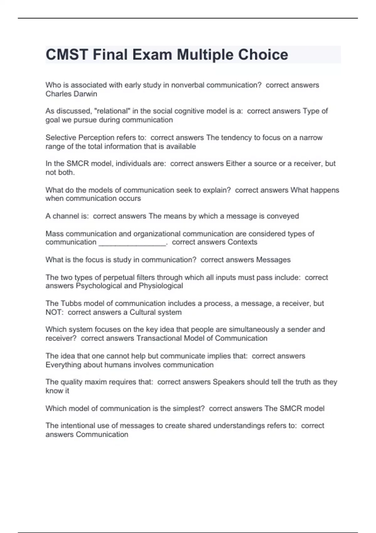 Who is associated with early study in nonverbal communication? correct answers Charles Darwin As discussed, "relational" in the social cognitive model is a: correct answers Type of goal we pursue during communication Selective Perception refers to: correct answers The tendency to focus on a narrow range of the total information that is available In the SMCR model, individuals are: correct answers Either a source or a receiver, but not both. What do the models of communication seek to explain? correct answers What happens when communication occurs A channel is: correct answers The means by which a message is conveyed Mass communication and organizational communication are considered types of communication ________________. correct answers Contexts What is the focus is study in communication? correct answers Messages The two types of perpetual filters through which all inputs must pass include: correct answers Psychological and Physiological The Tubbs model of communication includes a process, a message, a receiver, but NOT: correct answers a Cultural system Which system focuses on the key idea that people are simultaneously a sender and receiver? correct answers Transactional Model of Communication The idea that one cannot help but communicate implies that: correct answers Everything about humans involves communication The quality maxim requires that: correct answers Speakers should tell the truth as they know it Which model of communication is the simplest? correct answers The SMCR model The intentional use of messages to create shared understandings refers to: correct answers Communication Sociolinguistic knowledge as part of a social cognitive