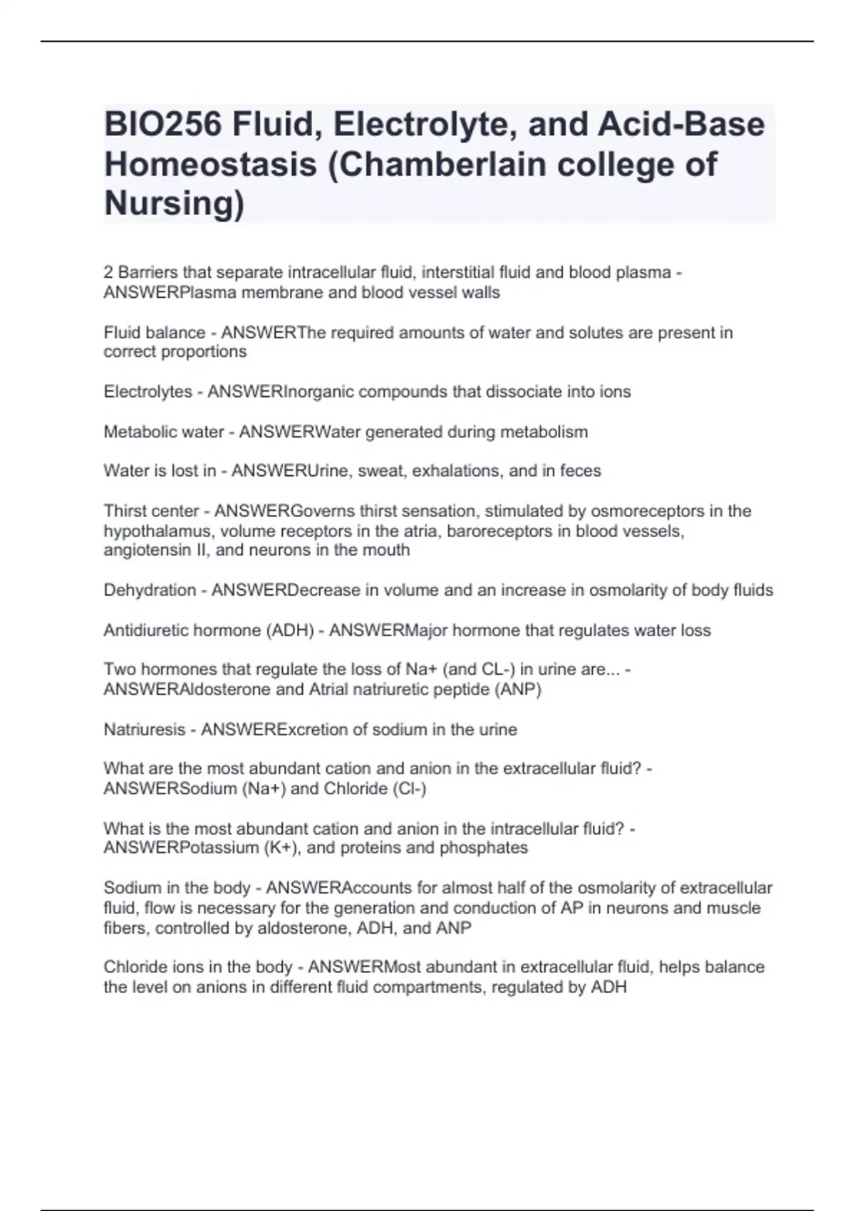BIO256 Fluid, Electrolyte, and Acid-Base Homeostasis (Chamberlain college of Nursing).Practices 2024 with solutions