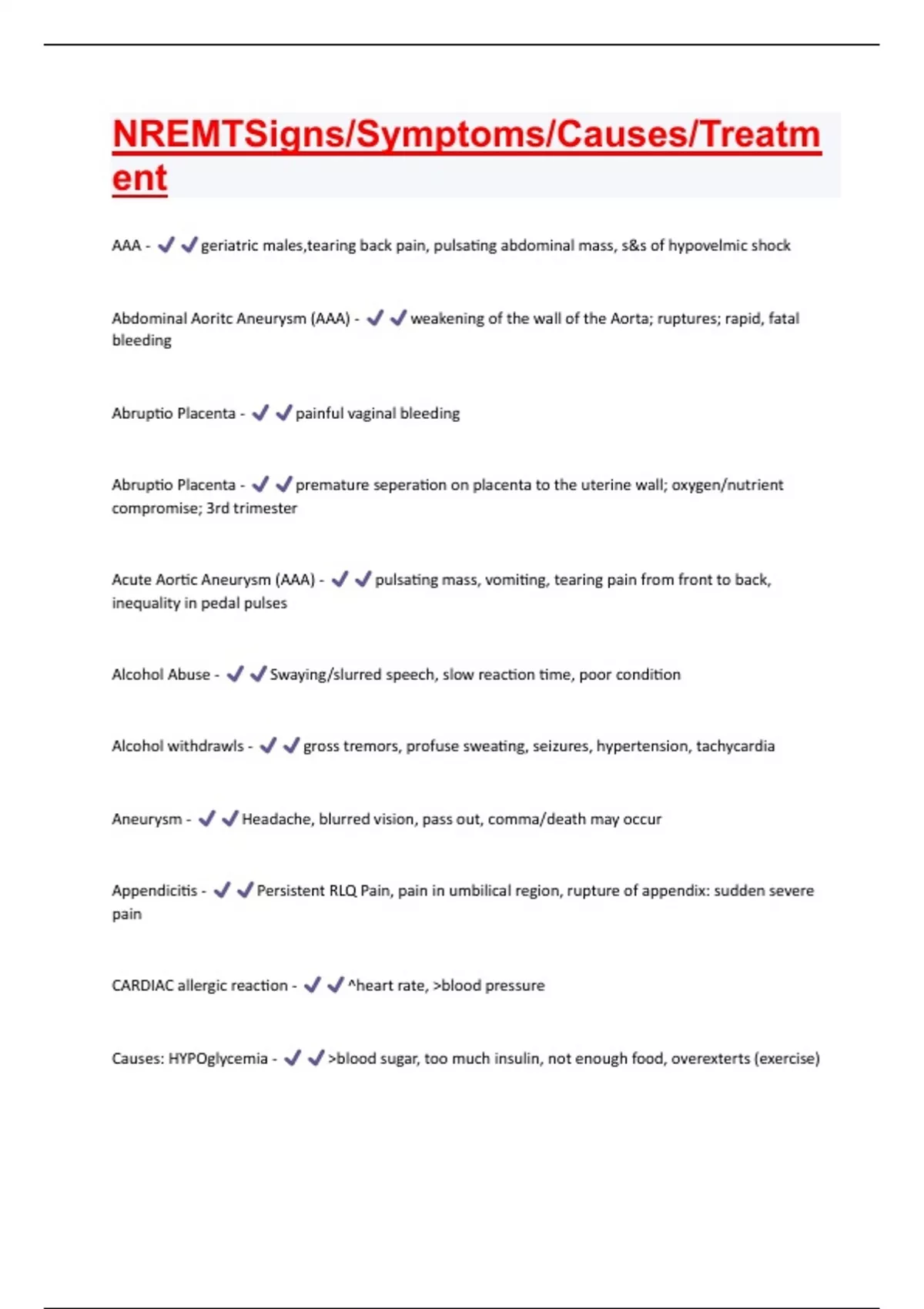 AAA - geriatric males,tearing back pain, pulsating abdominal mass, s&s of hypovelmic shock Abdominal Aoritc Aneurysm (AAA) - weakening of the wall of the Aorta; ruptures; rapid, fatal bleeding Abruptio Placenta - painful vaginal bleeding Abruptio Placenta - premature seperation on placenta to the uterine wall; oxygen/nutrient compromise; 3rd trimester Acute Aortic Aneurysm (AAA) - pulsating mass, vomiting, tearing pain from front to back, inequality in pedal pulses Alcohol Abuse - Swaying/slurred speech, slow reaction time, poor condition Alcohol withdrawls - gross tremors, profuse sweating, seizures, hypertension, tachycardia Aneurysm - Headache, blurred vision, pass out, comma/death may occur Appendicitis - Persistent RLQ Pain, pain in umbilical region, rupture of appendix: sudden severe pain CARDIAC allergic reaction - ^heart rate, >blood pressure Causes: HYPOglycemia - >blood sugar, too much insulin, not enough food, overexterts (exercise)Cholecystitis - Sharp RUQ or epiglastic pain, pain in shoulder (females 30-50 age group) Congestive Heart Failure - fever, cough (green/dark sputum), ^levels of CO2 in blood Congestive Heart Failure - tachycardia, dyspnea, ^blood pressure, diaphoresis, pulmonary edema, pedal edema, engorged pulsating neck veins, enlarged liver and spleen w/distention, anxiety/confusion due to hypoxia Cystic Fibrosis - fatigue, frequent pneumonia, coughing up blood/copious mucous, chills, abdominal pain/distention Cystic Fibrosis - Treat inadequate breathing and transport Diverticulitis - inflamed and infected occurance; Small pouches in intestine wall fill with feces (over 40 age group) Ecchymosis - bruising w/discoloration Eclampsia - mother siezes after preeclampsia; life-threatning for both Ectopic Pregnancy - implantion of egg outside of the uterus; ruptured uterus Edema - swelling Emesis - vomiting Emphysema - Shortness of breath, wheezing, coughing, possible weight loss Epiglotitis - Sore throat/difficulty swallowing, stridor, tripod position, muffled voiceEsophagael Varices - Hematemesis (bright red), history of alcoholism/liver disease, s&s of hypovelmic shock Esophageal Varices - weaking of the blood vessel lining of the esophagus; associated w/alcoholism ETOH - Ethyl Alcohol Gastroeneritis - contaminated food/water; lead to hypovelmic shock/common in pediatrics Gastroenteritis - diarrhea, nausea, and vomiting GI Bleeding - abnormal stool (dark black/maroon), vomiting "coffee grounds", slow loss of blood (chronic gastrointestinal hemorrage), blood from rectum