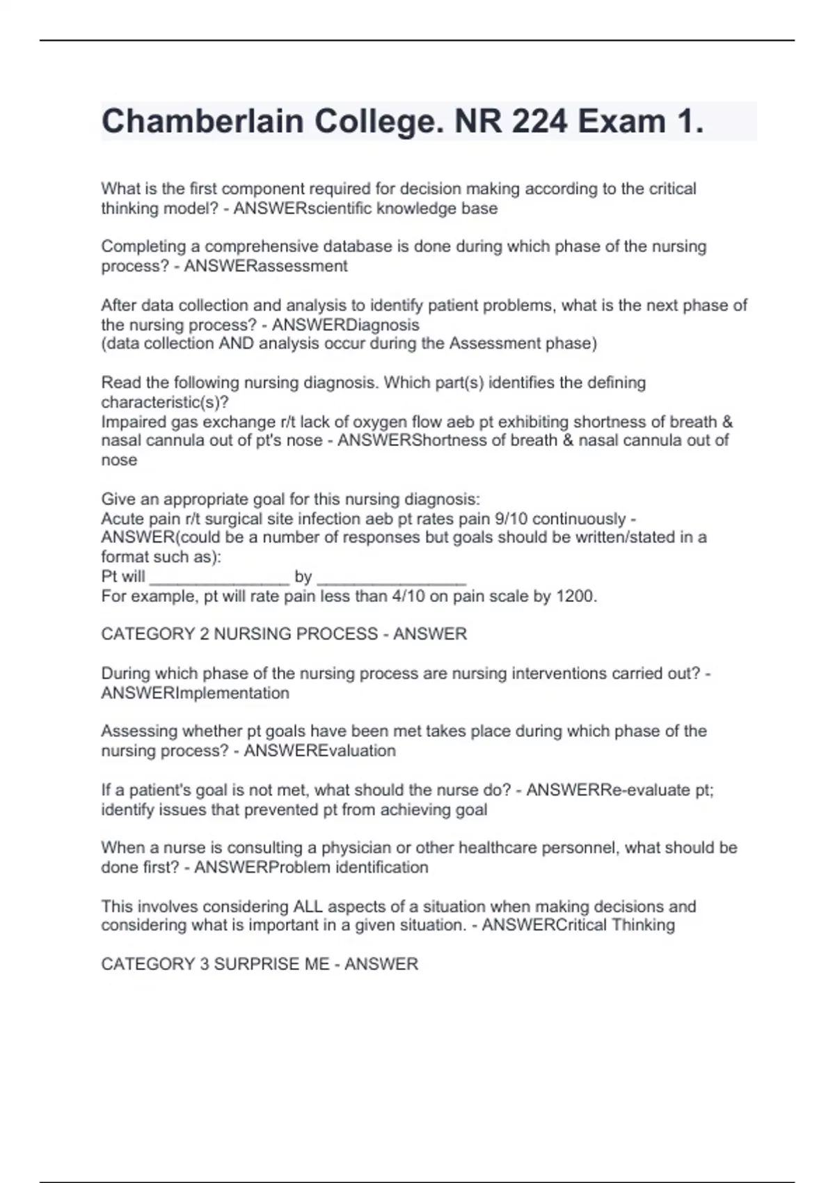 Chamberlain College. NR 224 Exam 1..Questions and answers solved