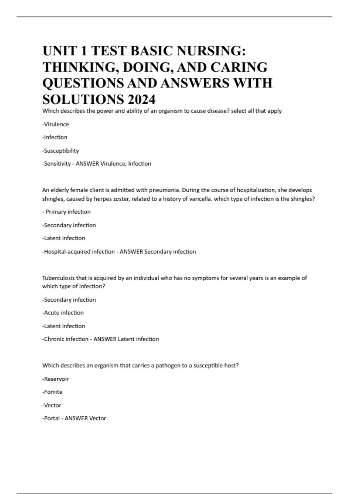 UNIT 1 TEST BASIC NURSING: THINKING, DOING, AND CARING QUESTIONS AND ANSWERS WITH SOLUTIONS 2024