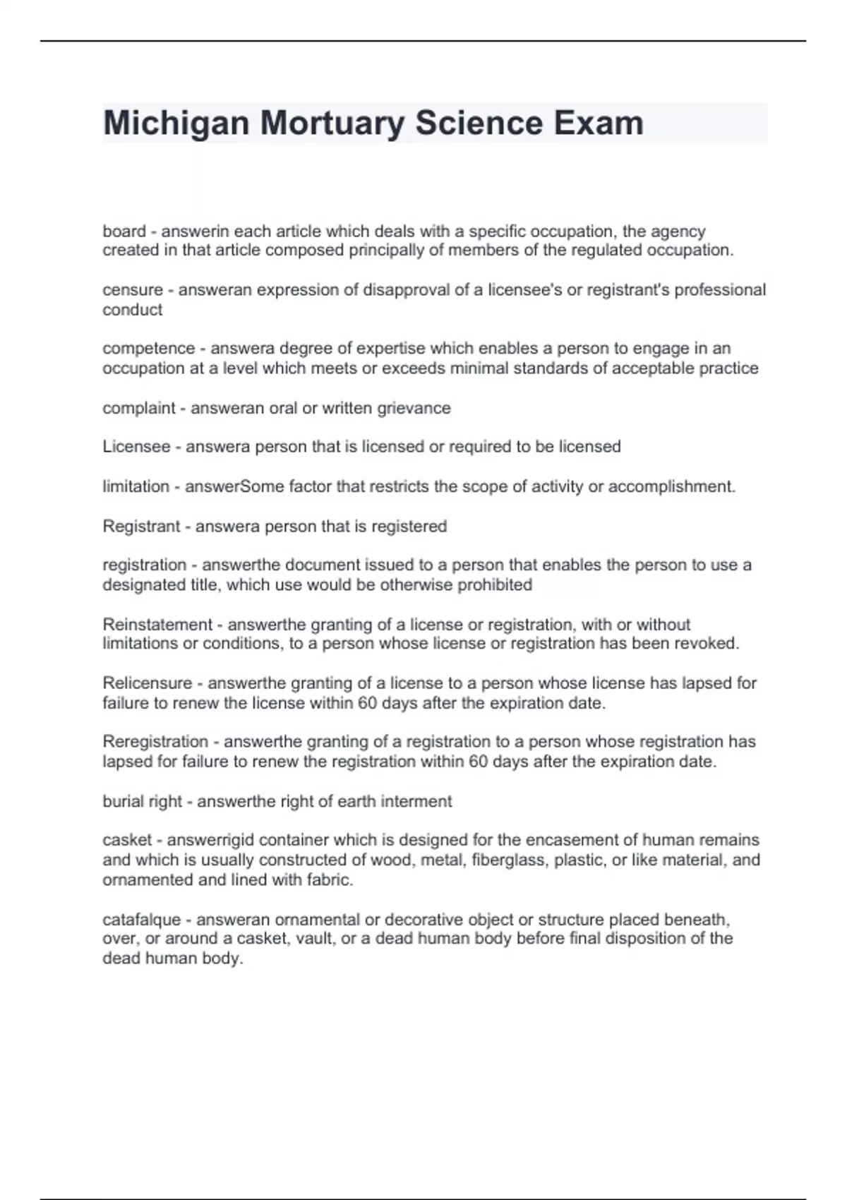 catafalque - answeran ornamental or decorative object or structure placed beneath, over, or around a casket, vault, or a dead human body before final disposition of the dead human body. Columbarium - answera building or other aboveground structure that is affixed to land and is a permanent repository for cremated human remains.