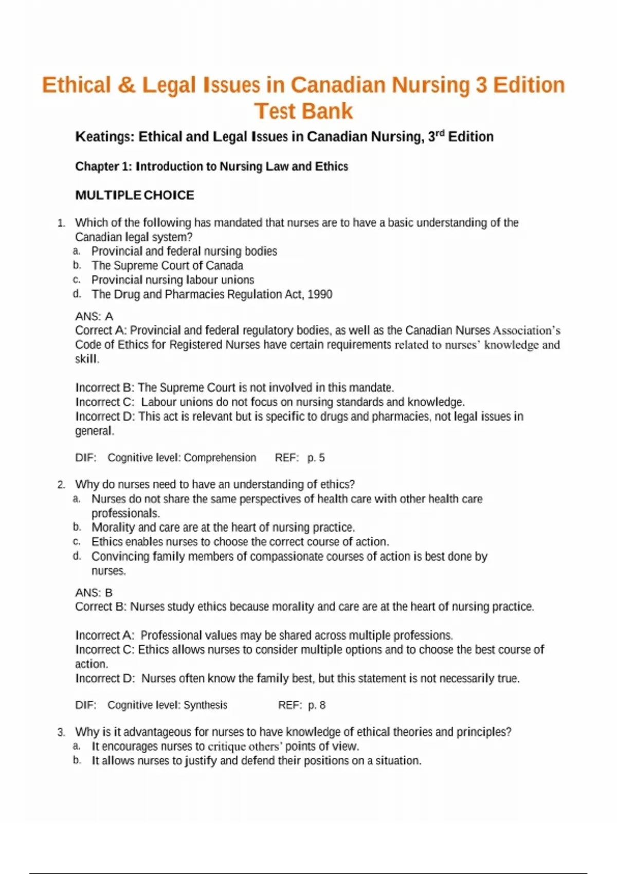 TEST BANK FOR ETHICAL AND LEGAL ISSUES IN CANADIAN NURSING 3RD EDTION by Margaret Keatings, O'Neil Smith