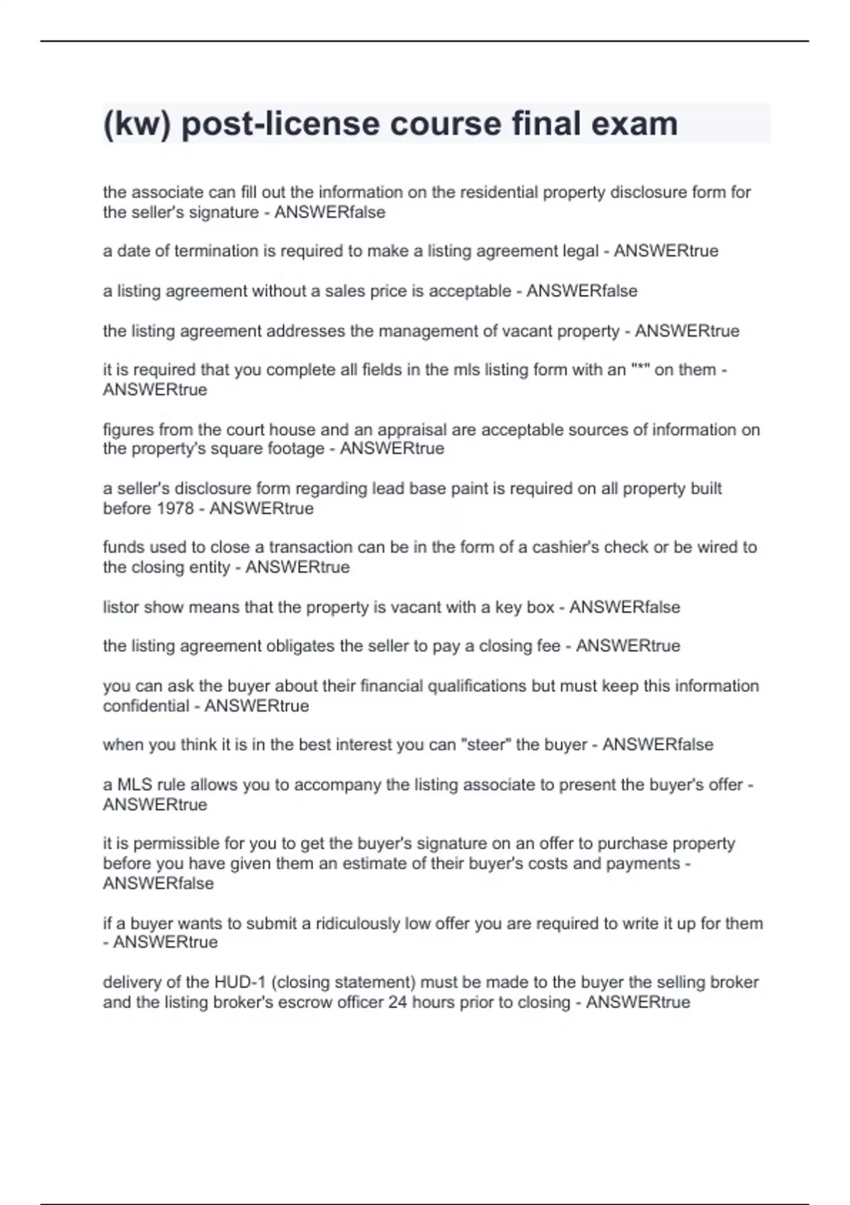 (kw) post-license course final exam.Actual exam question with detailed answers 2024