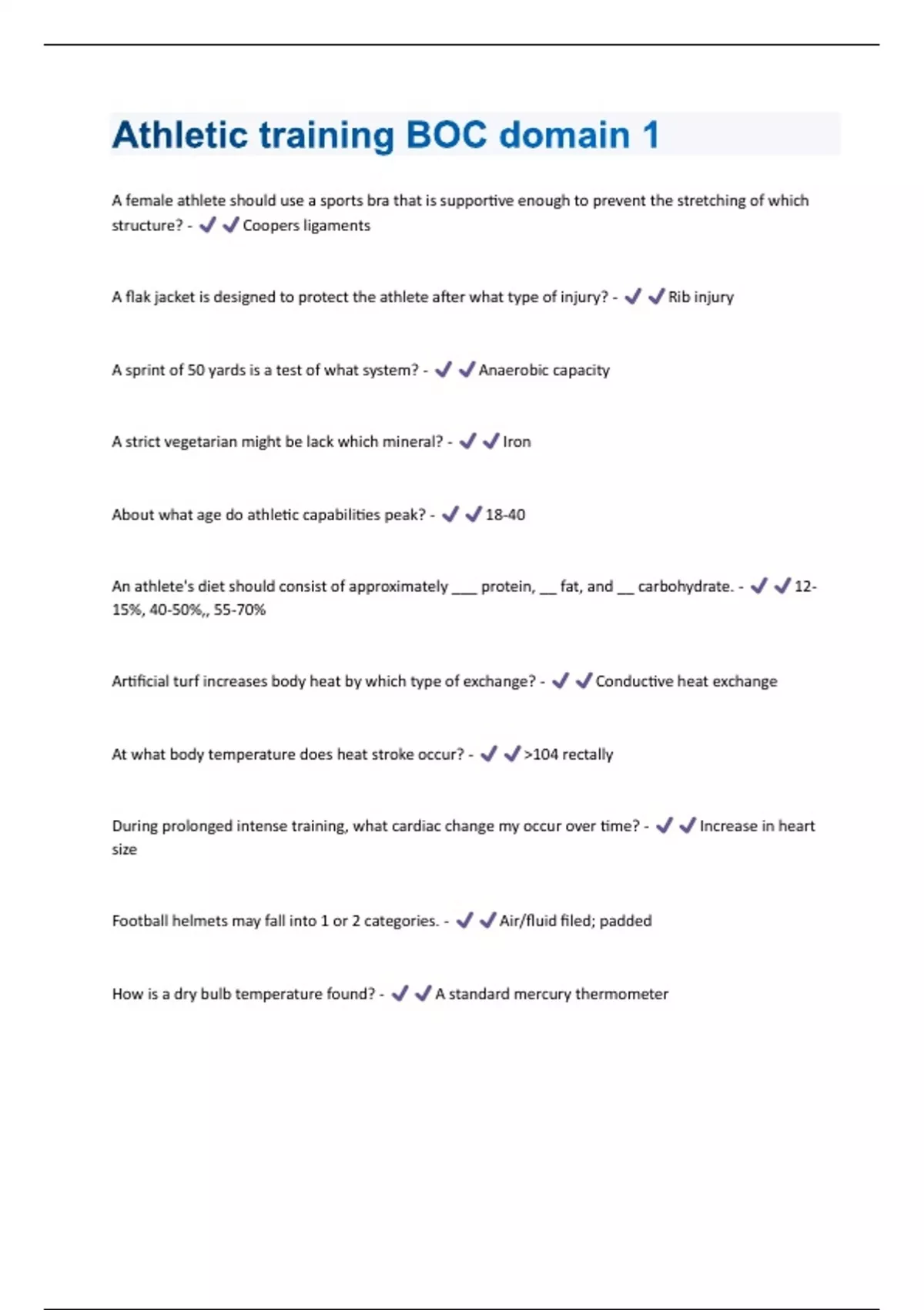 A female athlete should use a sports bra that is supportive enough to prevent the stretching of which structure? - Coopers ligaments A flak jacket is designed to protect the athlete after what type of injury? - Rib injury A sprint of 50 yards is a test of what system? - Anaerobic capacity A strict vegetarian might be lack which mineral? - Iron About what age do athletic capabilities peak? - 18-40 An athlete's diet should consist of approximately ___ protein, __ fat, and __ carbohydrate. - 12- 15%, 40-50%,, 55-70% Artificial turf increases body heat by which type of exchange? - Conductive heat exchange At what body temperature does heat stroke occur? - >104 rectally During prolonged intense training, what cardiac change my occur over time? - Increase in heart size Football helmets may fall into 1 or 2 categories. - Air/fluid filed; padded How is a dry bulb temperature found? - A standard mercury thermometerHow is the Q angle measured? - From the center of the ASIS through the center of the knee cap, then from the center of the knee cap. A second line is drawn from the midline of the anterior thigh to the tibial tubercle. The angle created is the Q angle How is wet bulb temperature found? - A wet wick or gauze wrapped around the end of the thermometer How long (generally) should a "warm-up" be to adequately prepare the body for athletic performance? - 10 to 15 minutes How long should a static stretch be held? - 10-30 seconds How many glasses of water should an athlete drink per day? - 8 or more How much calcium should a female athlete who shows signs of bone loss consume a day? - 1500 mg How should be toenails be cut to prevent ingrown toenails? - Straight across and weekly On the average, a college athlete expends between (blank) and (blank) calories per day - 2200 to 4400 The pre event meal should be eaten (blank) before competition to ensure digestion - 3-4 hours Under which conditions are a person at risk for a stress fracture? - A few high loads or many small loads are applied to the bone What about muscle fibers needs to be remembered? - Number of fibers is genetic