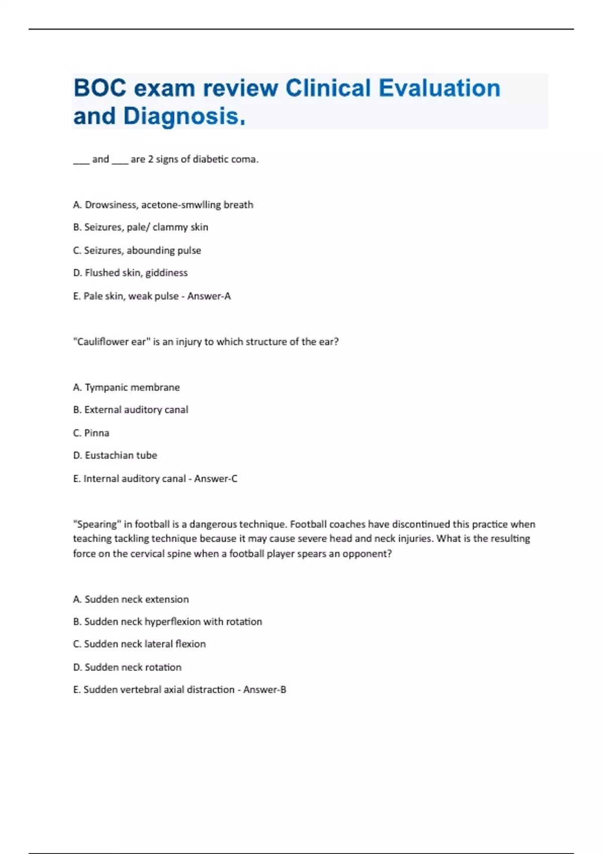 ___ and ___ are 2 signs of diabetic coma. A. Drowsiness, acetone-smwlling breath B. Seizures, pale/ clammy skin C. Seizures, abounding pulse D. Flushed skin, giddiness E. Pale skin, weak pulse - Answer-A "Cauliflower ear" is an injury to which structure of the ear? A. Tympanic membrane B. External auditory canal C. Pinna D. Eustachian tube E. Internal auditory canal - Answer-C "Spearing" in football is a dangerous technique. Football coaches have discontinued this practice when teaching tackling technique because it may cause severe head and neck injuries. What is the resulting force on the cervical spine when a football player spears an opponent? A. Sudden neck extension B. Sudden neck hyperflexion with rotation C. Sudden neck lateral flexion D. Sudden neck rotation E. Sudden vertebral axial distraction - Answer-BA ____ is a device used to measure joint range of motion. A. Goniometer B. Dynamometer C. Caliper D. Flexometer E. Sphygmomanometer - Answer-A A baseball player has been stung by a bee. This player has a history of a severe allergy to bee stings. A couple of minutes after being stung, the area becomes red and raised and begins to itch. The athlete begins to complain that his tongue feels thick, and he starts to have difficulty breathing. What type of shock is he beginning to develop? A. Neurogenic B. Metabolic C. Hypovolemic D. Respiratory E. Anaphylactic - Answer-E A basketball player reports to the athletic training facility complaining of a "burning" pain along the lateral aspect of his right knee during and after running. No edema or ecchymosis is found during the exam, but he is tender to palpation of the affected area. Which of the following special tests might be possible? A. Lachman's test B. Patellar apprehension test C. Ober's test D. Sag sign E. Faber's test - Answer-CA football quarterback is sacked during a game. He comes off the field holding his throwing arm and complains of chest and anterior shoulder pain. After evaluating the athlete, the athletic trainer suspects a torn pectoralis major muscle. Which of the following physical findings will be seen if the athletic trainer is correct? A. Ecchymosis around the xyphoid process B. Palpable defect in the posterior axilla C. Weakness in abduction and external rotation D. Weakness in adduction, flexion, and internal rotation of the affected arm E. Weakness in adduction and external rotation - Answer-D A grade I ankle sprain involves which structure? A. Tibiofibular ligament B. Posterior talofibular ligament C. Calcaneofibular ligament D. Anterior talofibular ligament E. Spring ligament - Answer-D A gymnast reports to the athletic trainer with a complaint of low back pain, which has been present for approximately 1 week. After being sent to the doctor for evaluation, a "Scottie dog" defect is seen on xray. This finding confirms which condition? A. Fractured transverse process of a vertebra B. Fractured demifacet of a vertebra C. Spondylolisthesis D. Spondylolysis E. A and B - Answer-DA lacrosse player comes limping into the athletic training facility with assistance from a coach. He is holding his leg in slight hip and knee flexion. There is a large bulge in the proximal thigh. During the exam, the athletic trainer requests the athlete to extend his knee as he sits on the edge of a taping table. He is able to partially straighten his leg, although there is pain down the anterior thigh area with the attempt to move it. What does the athletic trainer suspect is wrong? A. Biceps femoris rupture B. Femoral nerve injury C. Ruptured rectus femoris muscle D. Obturator nerve injury E. Iliopsoas rupture - Answer-C