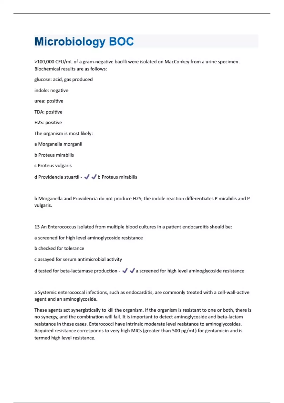 >100,000 CFU/mL of a gram-negative bacilli were isolated on MacConkey from a urine specimen. Biochemical results are as follows: glucose: acid, gas produced indole: negative urea: positive TDA: positive H2S: positive The organism is most likely: a Morganella morganii b Proteus mirabilis c Proteus vulgaris d Providencia stuartii - b Proteus mirabilis b Morganella and Providencia do not produce H2S; the indole reaction differentiates P mirabilis and P vulgaris. 13 An Enterococcus isolated from multiple blood cultures in a patient endocarditis should be: a screened for high level aminoglycoside resistance b checked for tolerance c assayed for serum antimicrobial activity d tested for beta-lactamase production - a screened for high level aminoglycoside resistance a Systemic enterococcal infections, such as endocarditis, are commonly treated with a cell-wall-active agent and an aminoglycoside. These agents act synergistically to kill the organism. If the organism is resistant to one or both, there is no synergy, and the combination will fail. It is important to detect aminoglycoside and beta-lactam resistance in these cases. Enterococci have intrinsic moderate level resistance to aminoglycosides. Acquired resistance corresponds to very high MICs (greater than 500 pg/mL) for gentamicin and is termed high level resistance.A 1-2 mm translucent, nonpigmented colony, isolated from an anaerobic culture of a lung abscess after 72 hours, was found to fluoresce brick-red under ultraviolet light. A Gram stain of the organism revealed a coccobacillus that had the following characteristics: growth in bile: inhibited vancomycin: resistant kanamycin: resistant colistin: susceptible catalase: negative esculin hydrolysis: negative indole: negative The identification of this isolate is: a Bacteroides ovatus b Prevotella oralis c Prevotella melaninogenica d Porphyromonas asaccharolytica - c Prevotella melaninogenica c Both Prevotella and Porphyromonas colonies fluoresce brick red. Porphyromonas is susceptible to vancomycin and can be catalase positive. A 10-year-old boy was admitted to the emergency room with lower right quadrant pain and tenderness. The following laboratory results were obtain . . Patient value Normal range % segmented neutrophils 75% 16%-60% WBC count 200 x 13^3/uL (200x10^9/L) 13.0 x 10^3/uL (13.0 x 10^9/L) The admitting diagnosis was appendicitis. During surgery the PP re isolated from the room enlarged node was removed and cultured. Small gram-negative bacilli were temperature plate. The organism most likely is. a Prevotella melaninogenicab Shigella sonnei c Listeria monocytogenes d Yersinia enterocolitica - d Yersinia enterocolitica