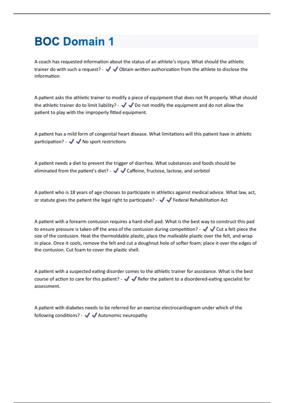 A coach has requested information about the status of an athlete's injury. What should the athletic trainer do with such a request? - Obtain written authorization from the athlete to disclose the information A patient asks the athletic trainer to modify a piece of equipment that does not fit properly. What should the athletic trainer do to limit liability? - Do not modify the equipment and do not allow the patient to play with the improperly fitted equipment. A patient has a mild form of congenital heart disease. What limitations will this patient have in athletic participation? - No sport restrictions A patient needs a diet to prevent the trigger of diarrhea. What substances and foods should be eliminated from the patient's diet? - Caffeine, fructose, lactose, and sorbitol A patient who is 18 years of age chooses to participate in athletics against medical advice. What law, act, or statute gives the patient the legal right to participate? - Federal Rehabilitation Act A patient with a forearm contusion requires a hard-shell pad. What is the best way to construct this pad to ensure pressure is taken off the area of the contusion during competition? - Cut a felt piece the size of the contusion. Heat the thermoldable plastic, place the malleable plastic over the felt, and wrap in place. Once it cools, remove the felt and cut a doughnut hole of softer foam; place it over the edges of the contusion. Cut foam to cover the plastic shell. A patient with a suspected eating disorder comes to the athletic trainer for assistance. What is the best course of action to care for this patient? - Refer the patient to a disordered-eating specialist for assessment. A patient with diabetes needs to be referred for an exercise electrocardiogram under which of the following conditions? - Autonomic neuropathyA patient with insulin dependency is moving to a high-altitude area to exercise. What must the patient know about glycemic control at high altitudes? - Glucose monitors have problems with reliability at high altitude A patient with iron-deficient anemia will require what form of nutrition? - Taking oral iron supplements with vitamin C A patient with limited range of motion in the hamstring muscle needs a stretch to perform at home to improve flexibility. Which of the following best describes an effective hamstring stretch? - Standing with affected leg on a table that is hip height, then leaning forward toward elevated leg A patient with sickle cell trait requires recommendation for preseason training and conditioning. What recommendations or accommodations are necessary to ensure the safety of this patient? - Provide gradual progression of exercise and longer recovery time between bouts A pre-participation exam should occur no more than how many weeks before the start of the season? - Six weeks before the start of season training According to the BOC Standards of Professional Practice, under whose medical direction is an athletic trainer? - Physician According to the NATA PS, how many pounds can be safely lost in one week? - 1 to 2 pounds per week An athlete has lost 5 pounds (~2.2 kg) during the course of a practice. How much fluid must the athlete consume in order to return to normal hydration status? - 120 oz (3.5 L) An athlete playing which football position is most likely to have a cervical spine injury resulting from head-down contact? - Defensive back An athletic trainer may have been exposed to a bloodborne pathogen. How long must documentation of this exposure be kept? - Thirty years from the date of the end of employment