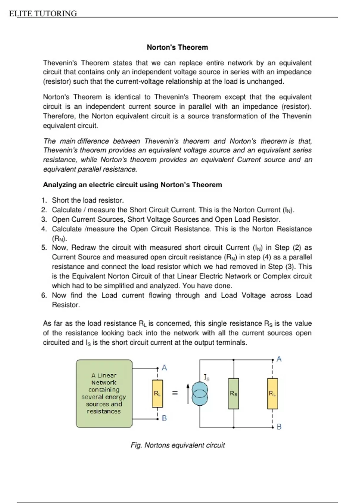 Norton's Theorem states that any linear electrical network with voltage and current sources can be simplified to a single current source in parallel with a single resistor. This simplification makes analyzing and understanding complex circuits easier by converting them into simpler equivalent forms.