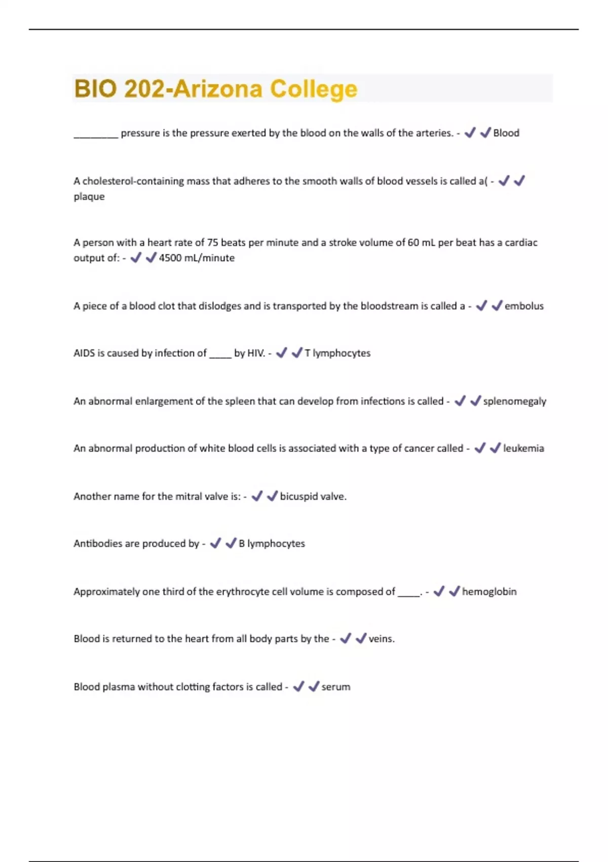BIO 202-Arizona College Questions And Answers (2024 / 20245 (Verified Answers)