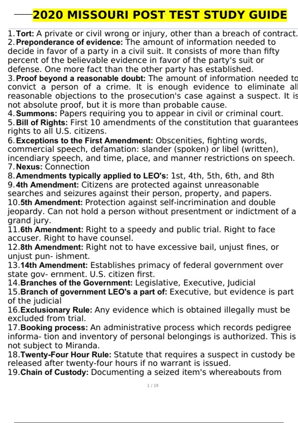 2020 MISSOURI POST TEST STUDY GUIDE 1. Tort: A private or civil wrong or injury, other than a breach of contract. 2. Preponderance of evidence: The amount of information needed to decide in favor of a party in a civil suit. It consists of more than fifty percent of the believable evidence in favor of the party's suit or defense. One more fact than the other party has established. 3. Proof beyond a reasonable doubt: The amount of information needed to convict a person of a crime. It is enough evidence to eliminate all reasonable objections to the prosecution's case against a suspect. It is not absolute proof, but it is more than probable cause.