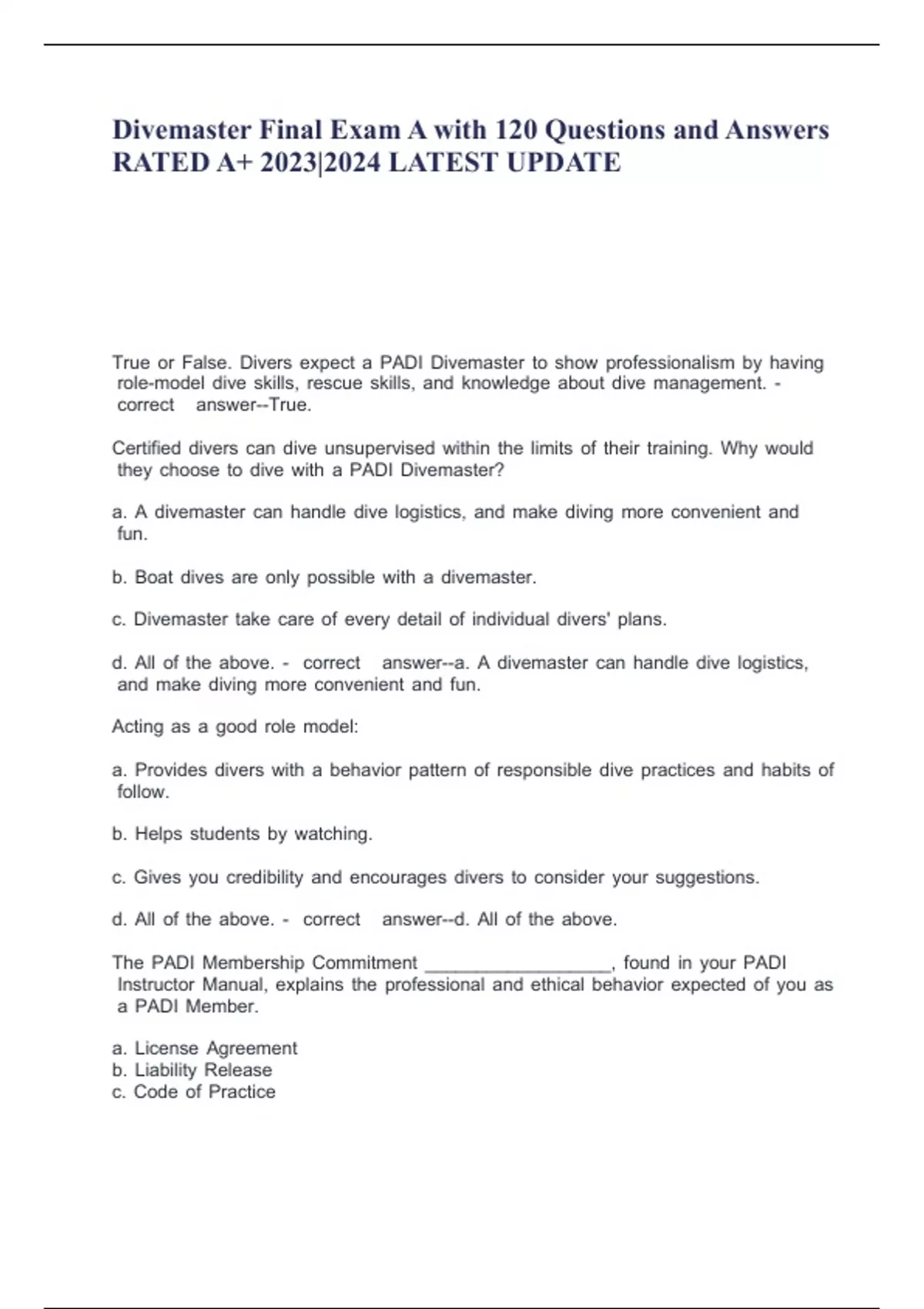 Divemaster Final Exam A with 120 Questions and Answers RATED A+ 2023|2024 LATEST UPDATE