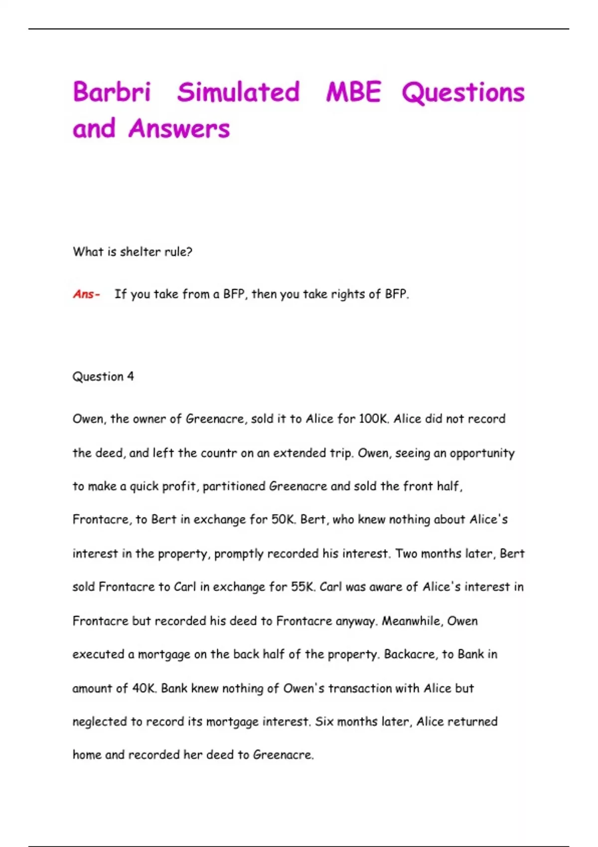 What is shelter rule? Ans- If you take from a BFP, then you take rights of BFP. Question 4 Owen, the owner of Greenacre, sold it to Alice for 100K. Alice did not record the deed, and left the countr on an extended trip. Owen, seeing an opportunity to make a quick profit, partitioned Greenacre and sold the front half, Frontacre, to Bert in exchange for 50K. Bert, who knew nothing about Alice's interest in the property, promptly recorded his interest. Two months later, Bert sold Frontacre to Carl in exchange for 55K. Carl was aware of Alice's interest in Frontacre but recorded his deed to Frontacre anyway. Meanwhile, Owen executed a mortgage on the back half of the property. Backacre, to Bank in amount of 40K. Bank knew nothing of Owen's transaction with Alice but neglected to record its mortgage interest. Six months later, Alice returned home and recorded her deed to Greenacre. A statute in the jurisdiction provides: "Any conveyance of an estate in land, other than a lease for less than one year, shall not be valid against any subsequent purchaser for value, without notice, unless the conveyance in recorded." If Alice brings an action to quiet title in Greenacre, how is a court likely to classify her claim? A) As superior to Owen's rights in Backacre and Carl's rights in Frontacre, and not subject to Bank's mortgage on Backacre. B) As superior to Owen's rights in Backacre, inferior to Carl's rights in Frontacre, and subject to Bank's mortgage on Backacre. C) As superior to Owen's rights in Backacre, inferior to Carl's rights in Frontacre, and not subject to Bank's mortgage on Backacre. D) As superior to Owen's rights in Backacre and Carl's rights in Frontacre, but subject to Bank's mortgage on Backacre. Correct answer: