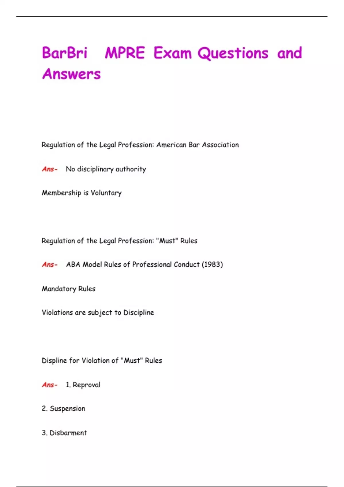 Regulation of the Legal Profession: American Bar Association Ans- No disciplinary authority Membership is Voluntary Regulation of the Legal Profession: "Must" Rules Ans- ABA Model Rules of Professional Conduct (1983) Mandatory Rules Violations are subject to Discipline Displine for Violation of "Must" Rules Ans- 1. Reproval 2. Suspension 3. Disbarment Reproval Ans- Censure or reprimand Mild Discipline Public or Private censure/reprimand Suspension Ans- Prohibited from practicing law for a finite period Name remains on the firm stationary and the door Disbarment Ans- Permenant punishment Name removed from firm name, door, and stationary Types of MPRE "Must" Questions (The "Call" of the Question) Ans- The lawyer MUST.... The lawyer MUST NOT..