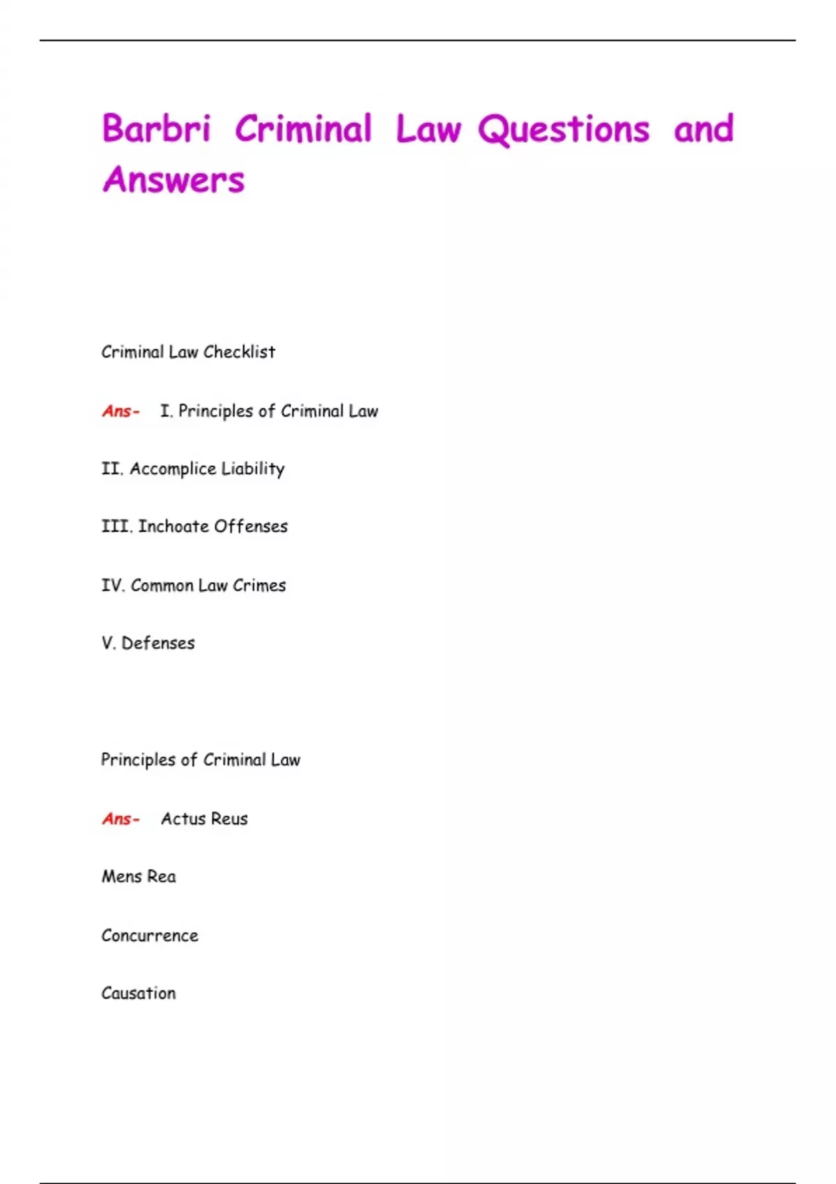 Criminal Law Checklist Ans- I. Principles of Criminal Law II. Accomplice Liability III. Inchoate Offenses IV. Common Law Crimes V. Defenses Principles of Criminal Law Ans- Actus Reus Mens Rea Concurrence Causation Accomplice Liability Ans- The accomplice must have acted with intent to aid or encourage the principal. More than One Party Parties: Principal, Accomplice, Accessory After the Fact Defense of Withdrawal Parties Ans- Principal, Accomplice, or Accessory After the fact Accomplice Ans- With INTENT to commit crime must ACTIVELY AID, ABET,or COUNSEL PRINCIPAL mere presence is not enough Liable for crime itself and all other F