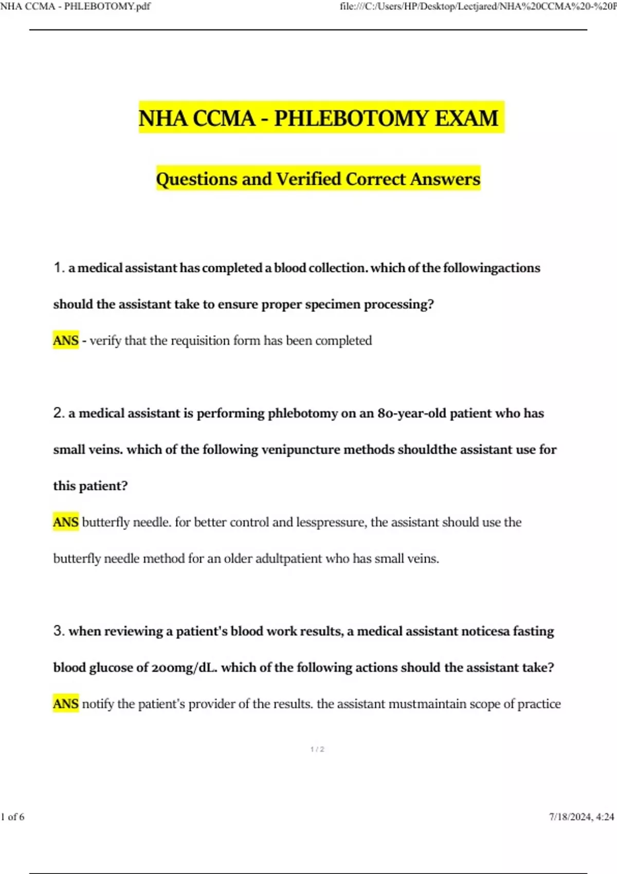 NHA CCMA - PHLEBOTOMY EXAM 2024 Questions and Answers Updated (2024 / 2025) (Verified Answers)