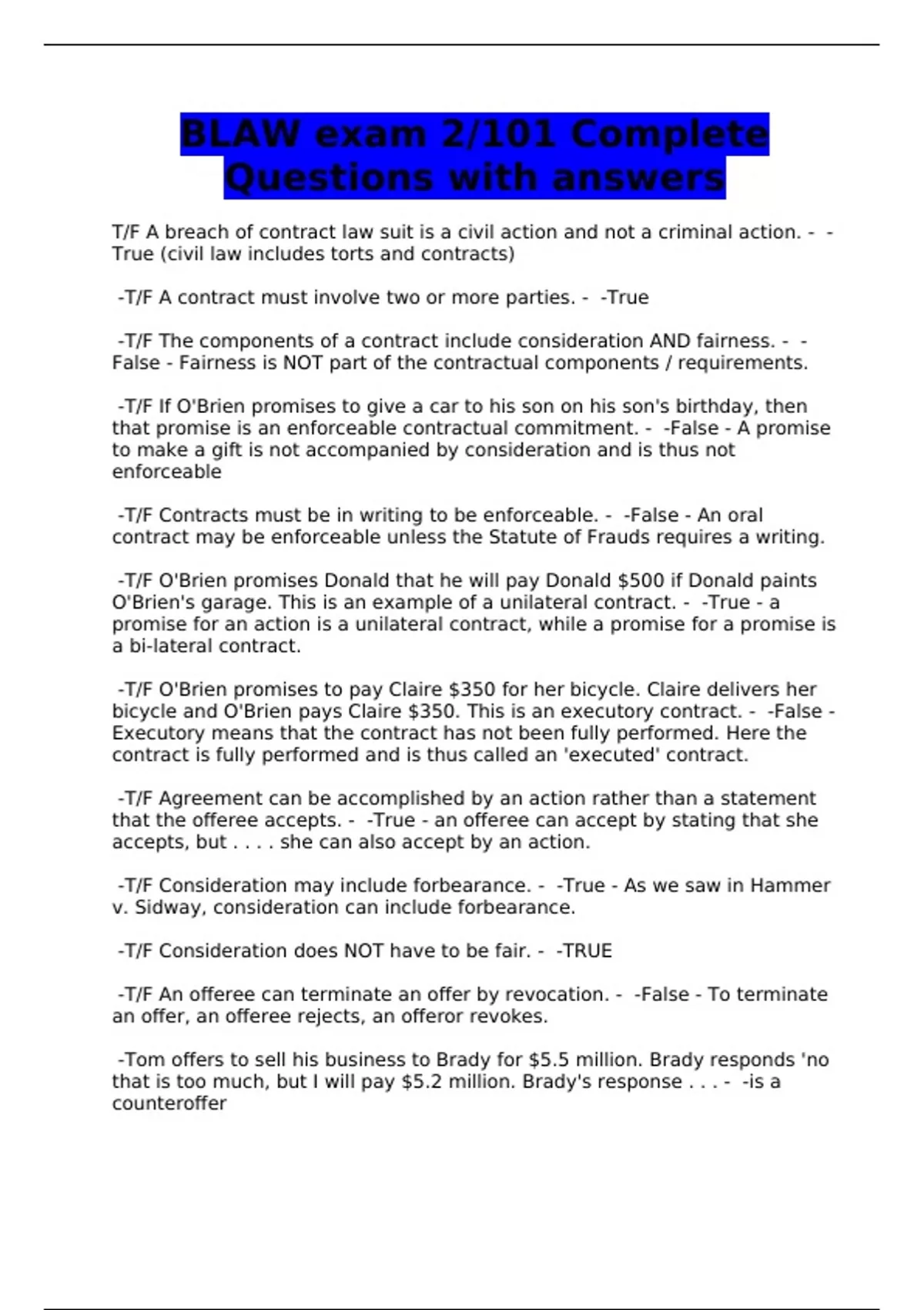 blaw exam 2101 complete questions with answers