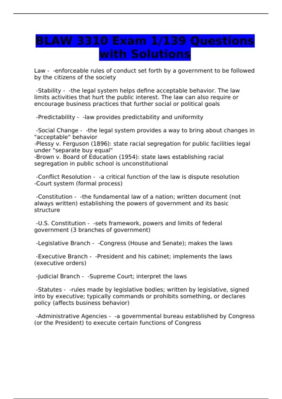 BLAW 3310 Exam 1/139 Questions with Solutions