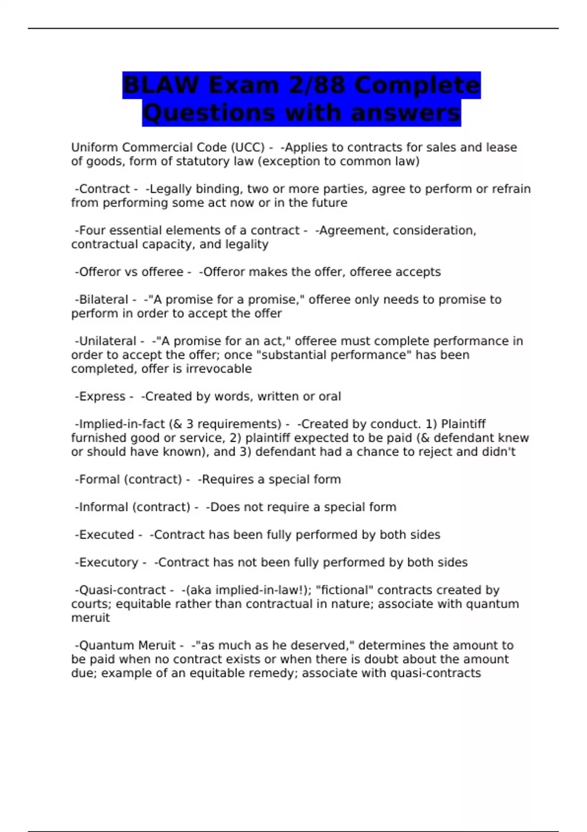 BLAW Exam 2/88 Complete Questions with answers