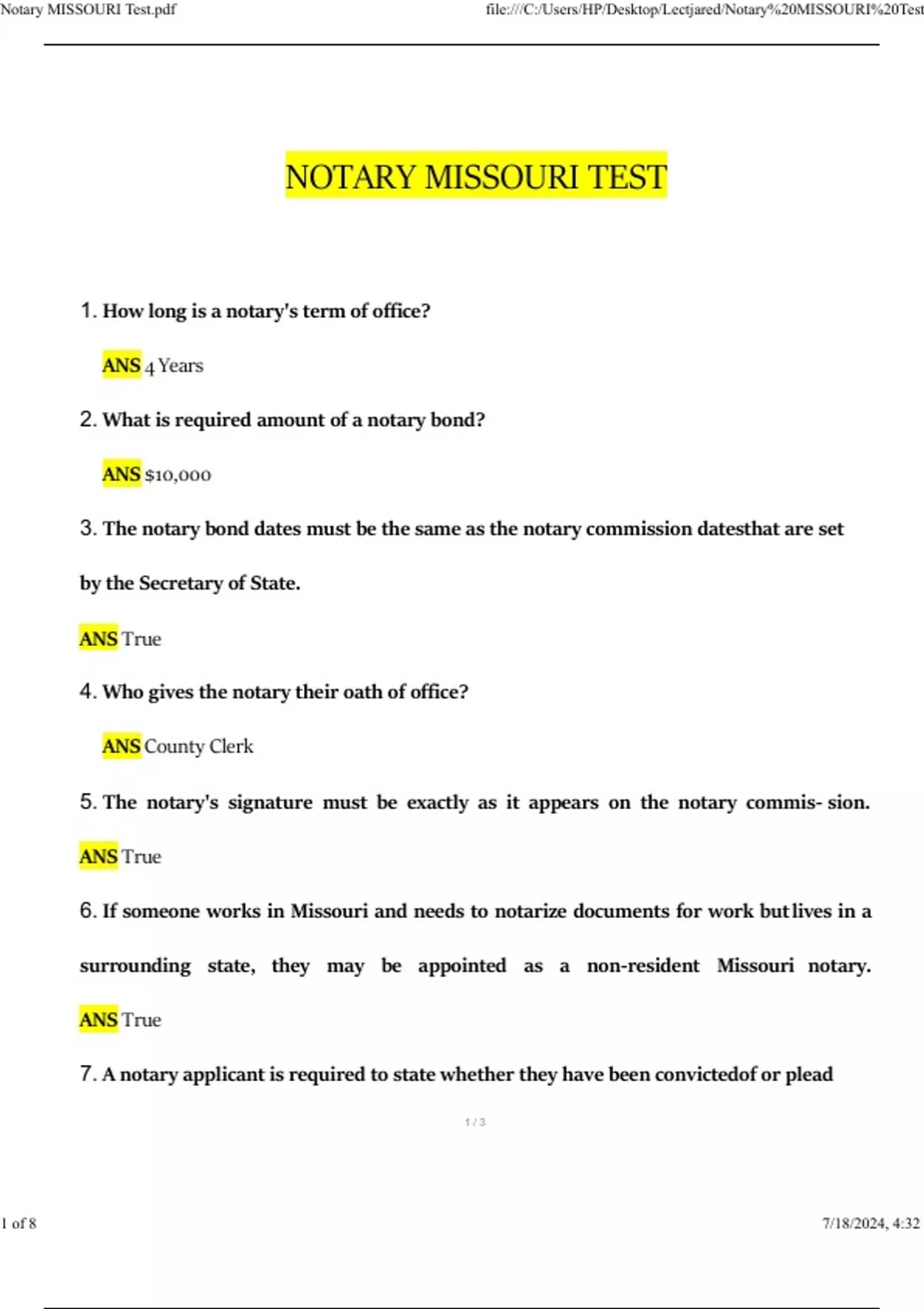 Notary MISSOURI Test 2024 Questions and Answers Updated (2024 / 2025) (Verified Answers)