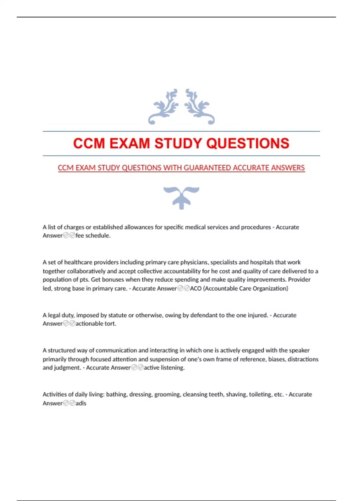 CCM EXAM STUDY QUESTIONS CCM EXAM STUDY QUESTIONS WITH GUARANTEED ACCURATE ANSWERS A list of charges or established allowances for specific medical services and procedures - Accurate Answerfee schedule. A set of healthcare providers including primary care physicians, specialists and hospitals that work together collaboratively and accept collective accountability for he cost and quality of care delivered to a population of pts. Get bonuses when they reduce spending and make quality improvements. Provider led, strong base in primary care. - Accurate AnswerACO (Accountable Care Organization) A legal duty, imposed by statute or otherwise, owing by defendant to the one injured. - Accurate Answeractionable tort. A structured way of communication and interacting in which one is actively engaged with the speaker primarily through focused attention and suspension of one's own frame of reference, biases, distractions and judgment. - Accurate Answeractive listening. Activities of daily living: bathing, dressing, grooming, cleansing teeth, shaving, toileting, etc. - Accurate Answeradls Statistical analysis of a population based on its utilization of healthcare services and demographic trends of the population. Results used to estimate healthcare plan premiums or Costs. - Accurate Answeractuarial study A trained insurance professional who specializes in determining policy rates, calculating premiums, and conducting statistical studies. - Accurate Answeractuary Administrative services only-or TPA third party administrator. Processes and manages claims. Employer is at risk for the cost of healthcare services provided. - Accurate AnswerASO Occurs within 24 hrs of client's admission to facility or according to time frame required in contractual agreement. Is the IP setting necessary, based on client's health condition and intensity of the services needed - Accurate AnswerAdmission review A sworn written statement - Accurate Answeraffidavit Aggregated Diagnosis Groups- codes that are similar in terms of severity and likelihood of persistence in a client's health condition over time. There are a total of 32. - Accurate Answeradgs Other diagnostic and therapeutic services that may be involved in the care of patient, not nursing or medicine. - Accurate AnswerAncillary services Paying medical benefits directly to provider of care rather than to member. - Accurate Answerassignment of benefits Any tool that is desig