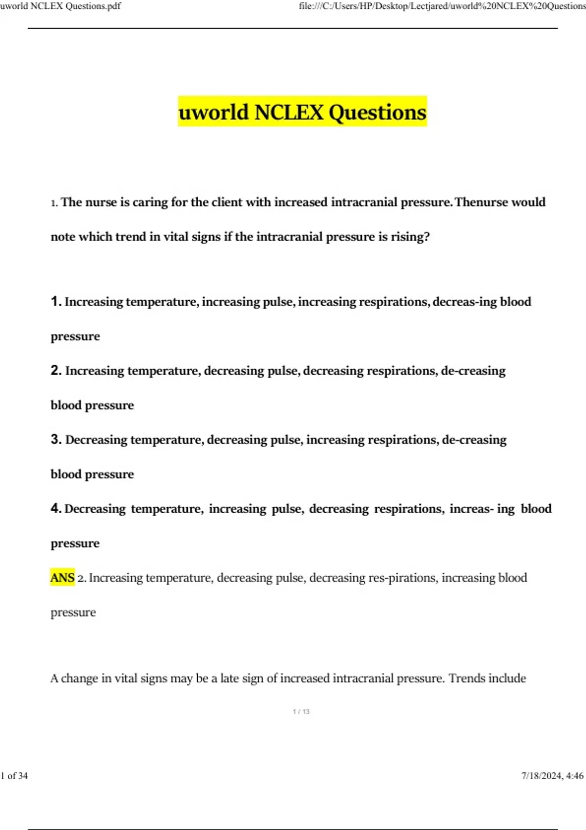 Uworld NCLEX Questions and Answers Updated (2024 / 2025) (Verified Answers)