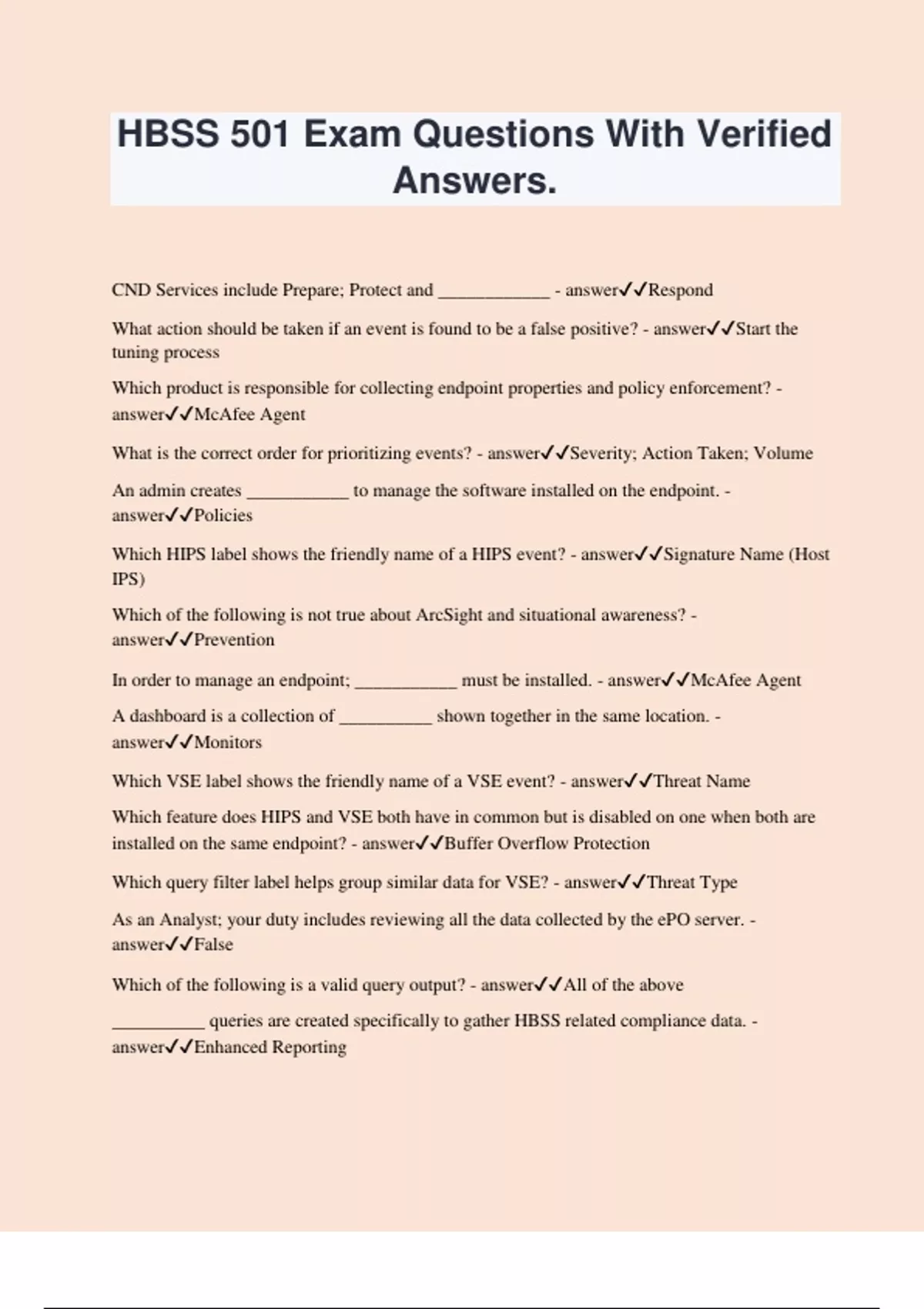 HBSS 501 Exam Questions With Verified Answers. CND Services include Prepare; Protect and ____________ - answerRespond What action should be taken if an event is found to be a false positive? - answerStart the tuning process Which product is responsible for collecting endpoint properties and policy enforcement? - answerMcAfee Agent What is the correct order for prioritizing events? - answerSeverity; Action Taken; Volume An admin creates ___________ to manage the software installed on the endpoint. - answerPolicies Which HIPS label shows the friendly name of a HIPS event? - answerSignature Name (Host IPS) Which of the following is not true about ArcSight and situational awareness? - answerPrevention In order to manage an endpoint; ___________ must be installed. - answerMcAfee Agent A dashboard is a collection of __________ shown together in the same location. - answerMonitors Which VSE label shows the friendly name of a VSE event? - answerThreat Name Which feature does HIPS and VSE both have in common but is disabled on one when both are installed on the same endpoint? - answerBuffer Overflow Protection Which query filter label helps group similar data for VSE? - answerThreat Type As an Analyst; your duty includes reviewing all the data collected by the ePO server. - answerFalse Which of the following is a valid query output? - answerAll of the above __________ queries are created specifically to gather HBSS related compliance data. - answerEnhanced Reporting