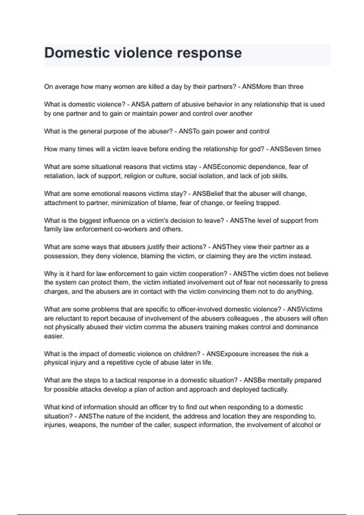 Domestic violence response questions and answers A+ score assured 2024/2025