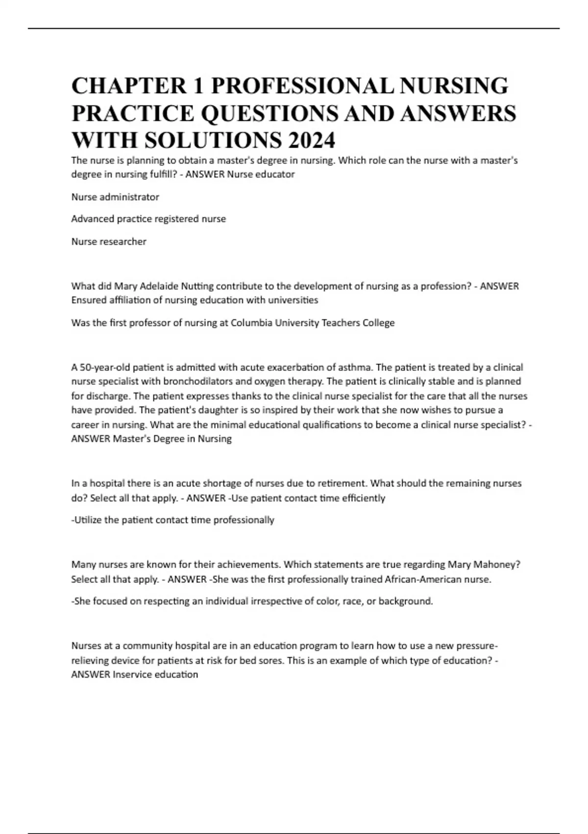 CHAPTER 1 PROFESSIONAL NURSING PRACTICE QUESTIONS AND ANSWERS WITH SOLUTIONS 2024