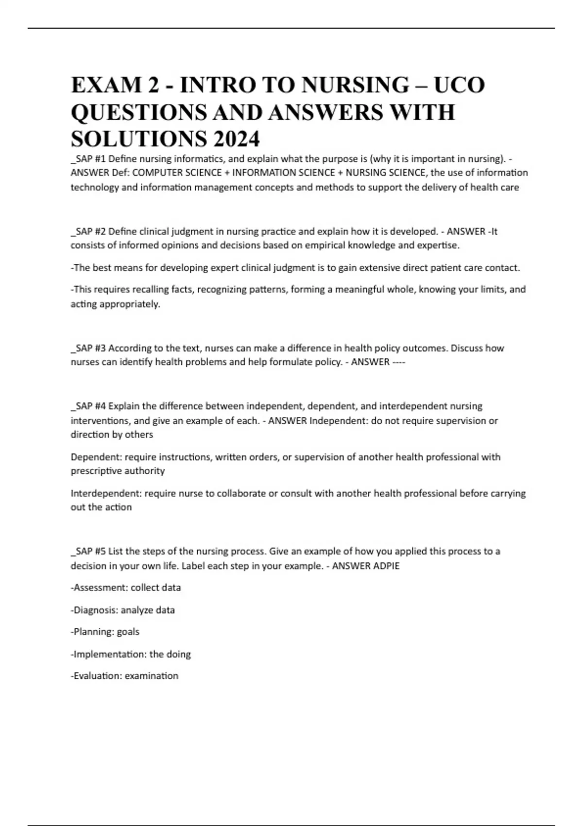 EXAM 2 - INTRO TO NURSING – UCO QUESTIONS AND ANSWERS WITH SOLUTIONS 2024