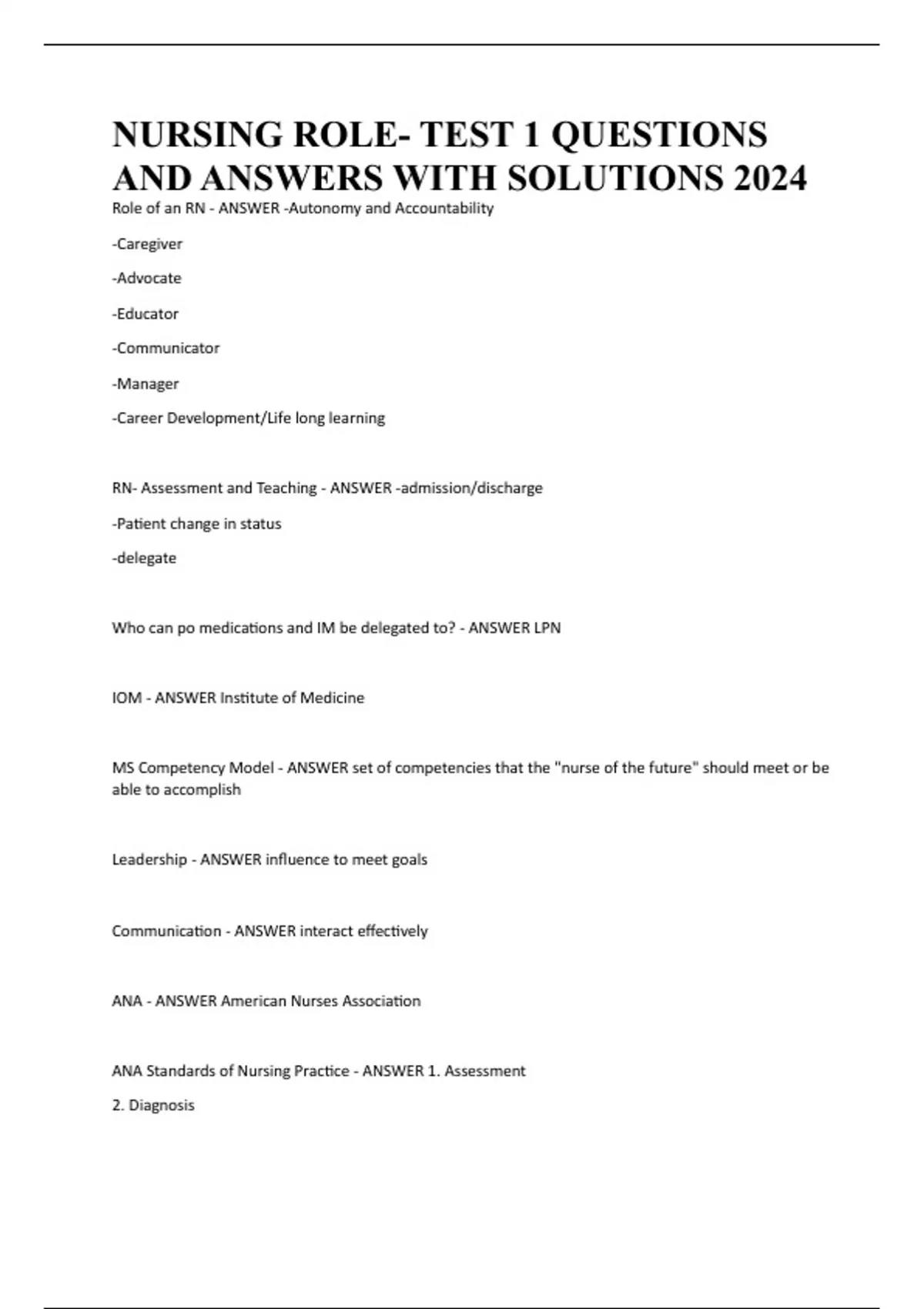 NURSING ROLE- TEST 1 QUESTIONS AND ANSWERS WITH SOLUTIONS 2024