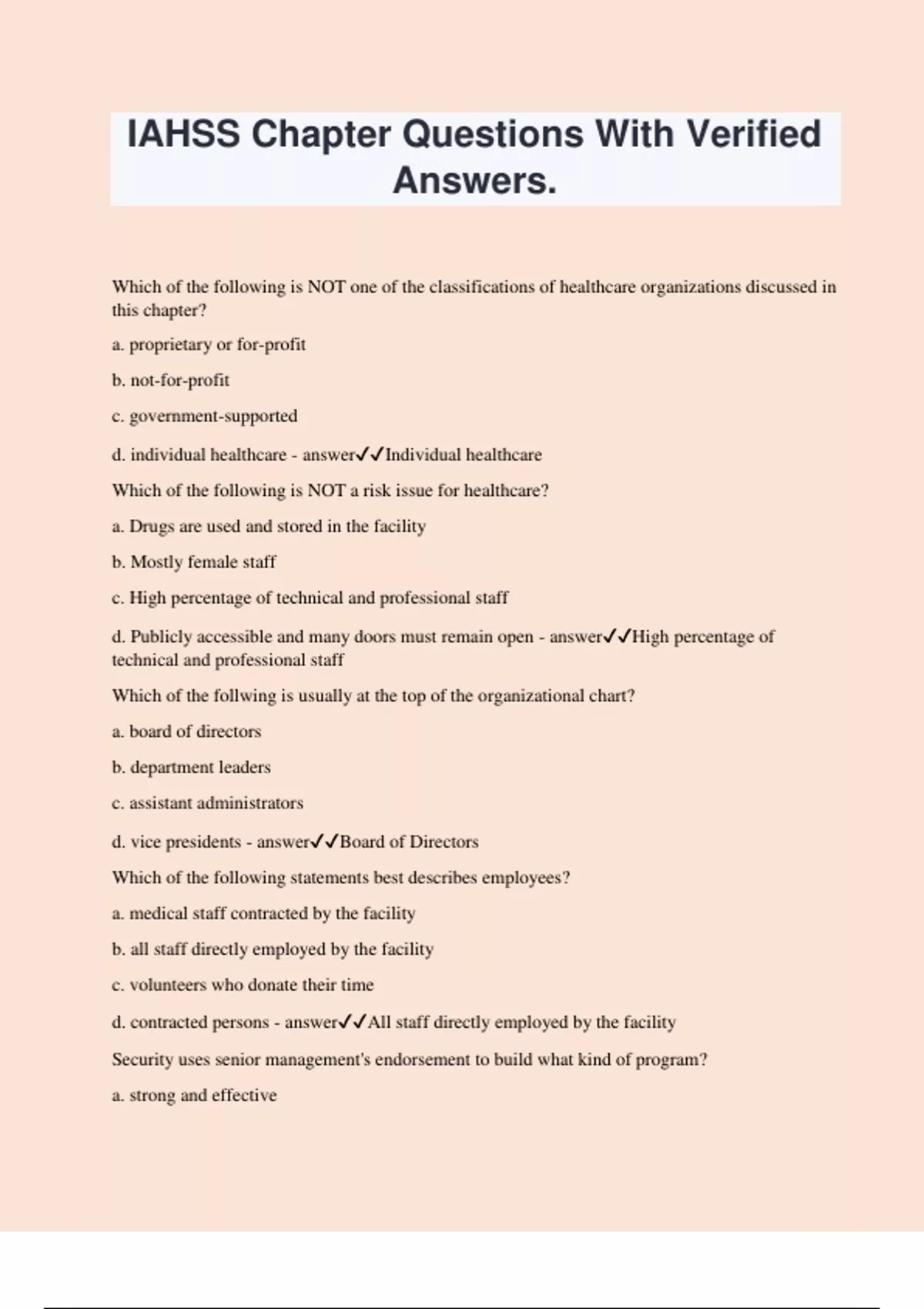 IAHSS Chapter Questions With Verified Answers. Which of the following is NOT one of the classifications of healthcare organizations discussed in this chapter? a. proprietary or for-profit b. not-for-profit c. government-supported d. individual healthcare - answerIndividual healthcare Which of the following is NOT a risk issue for healthcare? a. Drugs are used and stored in the facility b. Mostly female staff c. High percentage of technical and professional staff d. Publicly accessible and many doors must remain open - answerHigh percentage of technical and professional staff Which of the follwing is usually at the top of the organizational chart? a. board of directors b. department leaders c. assistant administrators d. vice presidents - answerBoard of Directors Which of the following statements best describes employees? a. medical staff contracted by the facility b. all staff directly employed by the facility c. volunteers who donate their time d. contracted persons - answerAll staff directly employed by the facility Security uses senior management's endorsement to build what kind of program? a. strong and effective b. a program that works in a small part of the facility c. generally effective d. strong and simple - answerStrong and Effective How should friendships and interpersonal relationships between security officers and staff members from other departments be treated? a. Discouraged b. Encouraged c. Encouraged, but monitored d. Encouraged, but security staff educated about ethics and avoiding favoritism - answerEncouraged, but security staff educated about ethics and avoiding favoritism Which of the following allows a department to assess its cost-effectiveness within an organization? a. crime analysis b. risk assessments c. benchmarking - answerBenchmarking What should the most primary overriding concern of any security department be? a. It's image b. The safety and well-being of anyone in the facility c. the goals and missions of the entity employing the security services d. Cost-effectiveness - answerThe goals and mission of the entity employing the security services Which of the following are skills a security professional should have and use at all times? a. good observation skills b. good communication skills c. tolerance d. all the above - answerAll the above Why are vendors potentially a high-security risk to a health care facility? a. Vendors often have access to sensitive areas yet staff of the healthcare organizations may know very little about vendors background. b. vendors typically drive large vehicles that can conceal large amounts of stolen property or contraband c. completing vendors may clash at a facility d. vendors may be bringing in high-demand products that could be targeted for theft - answerVendors often have access to sensitive areas yet staff of the healthcare organizations may know very little about vendors background In the patient- and family-centered care philosophy, who determines which individuals are part of the patient's family? a. patient's parents or legal guardians b. nursing staff c. attending physician d. the patient provided he or she is developmentally mature and competent to do so - answerThe patient provided he or she is developmentally mature and competent to do so Which of the following is NOT an example of an external customer? a. patients b. vendors c. employees d. regulatory agencies - answerEmployees Which of the following does NOT help the security uniform communicate an appropriate message to the public? a. clean uniform b. wearing the uniform shirt untucked c. well-cared-for uniform d. shined footwear - answerWearing the uniform shirt untucked Which of the following is NOT an example of undesirable behavior and demeanor in a security officer? a. bad attitude b. dishonesty c. impoliteness d. confidence - answerConfidence