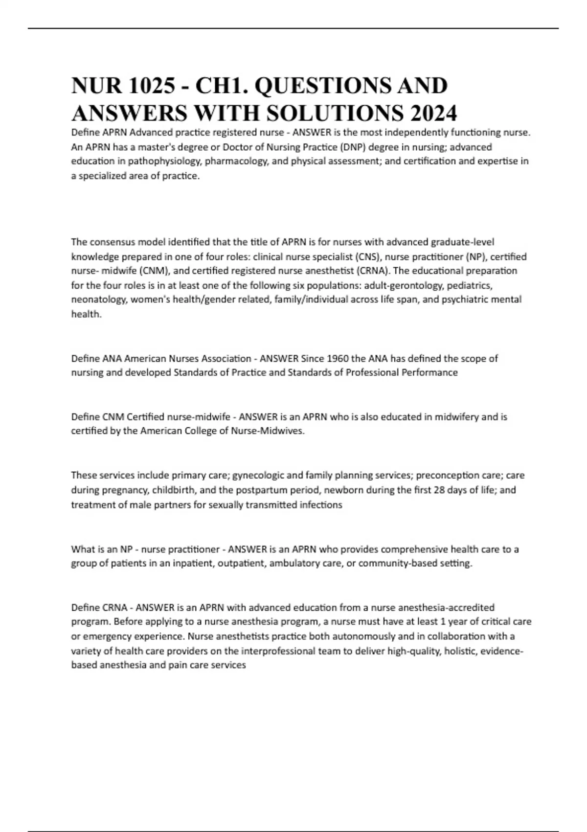 NUR 1025 - CH1. QUESTIONS AND ANSWERS WITH SOLUTIONS 2024