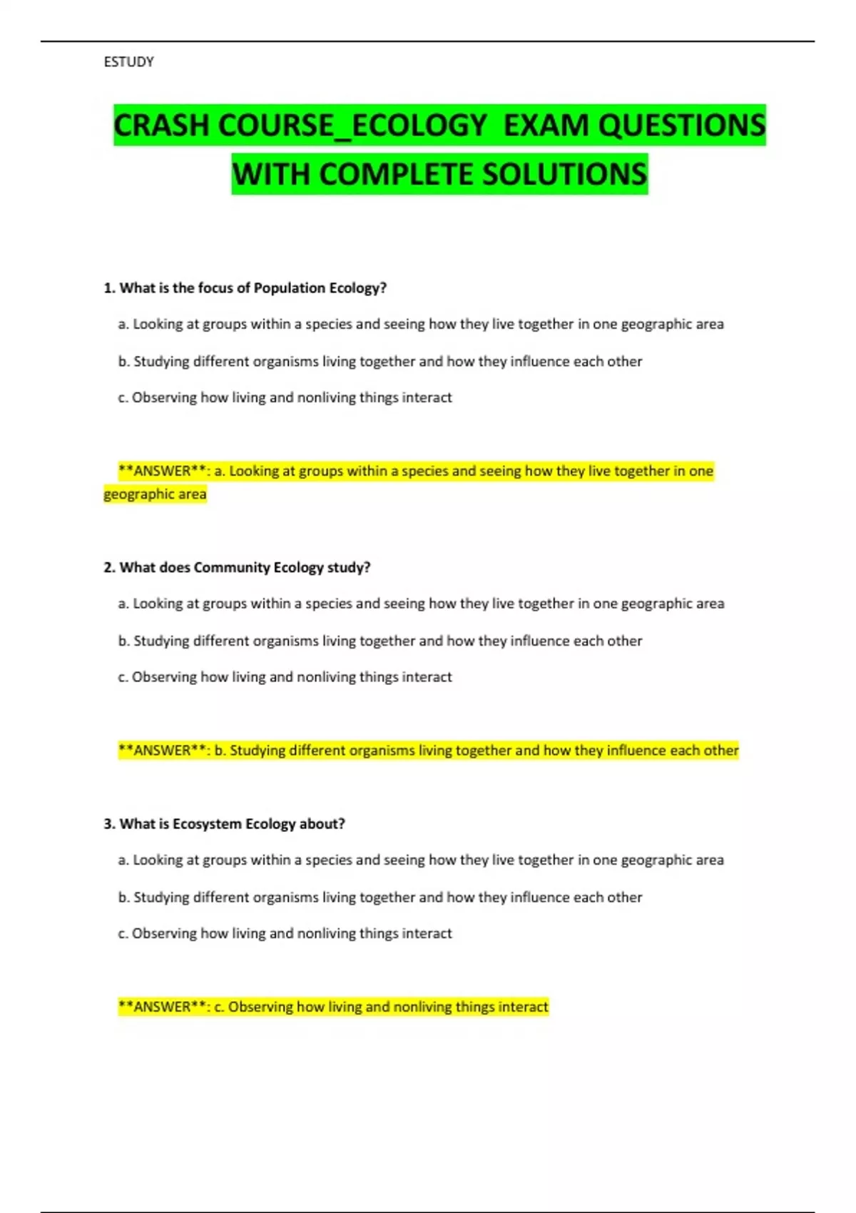 CRASH COURSE_ECOLOGY EXAM QUESTIONS WITH COMPLETE SOLUTIONS 2024/2025