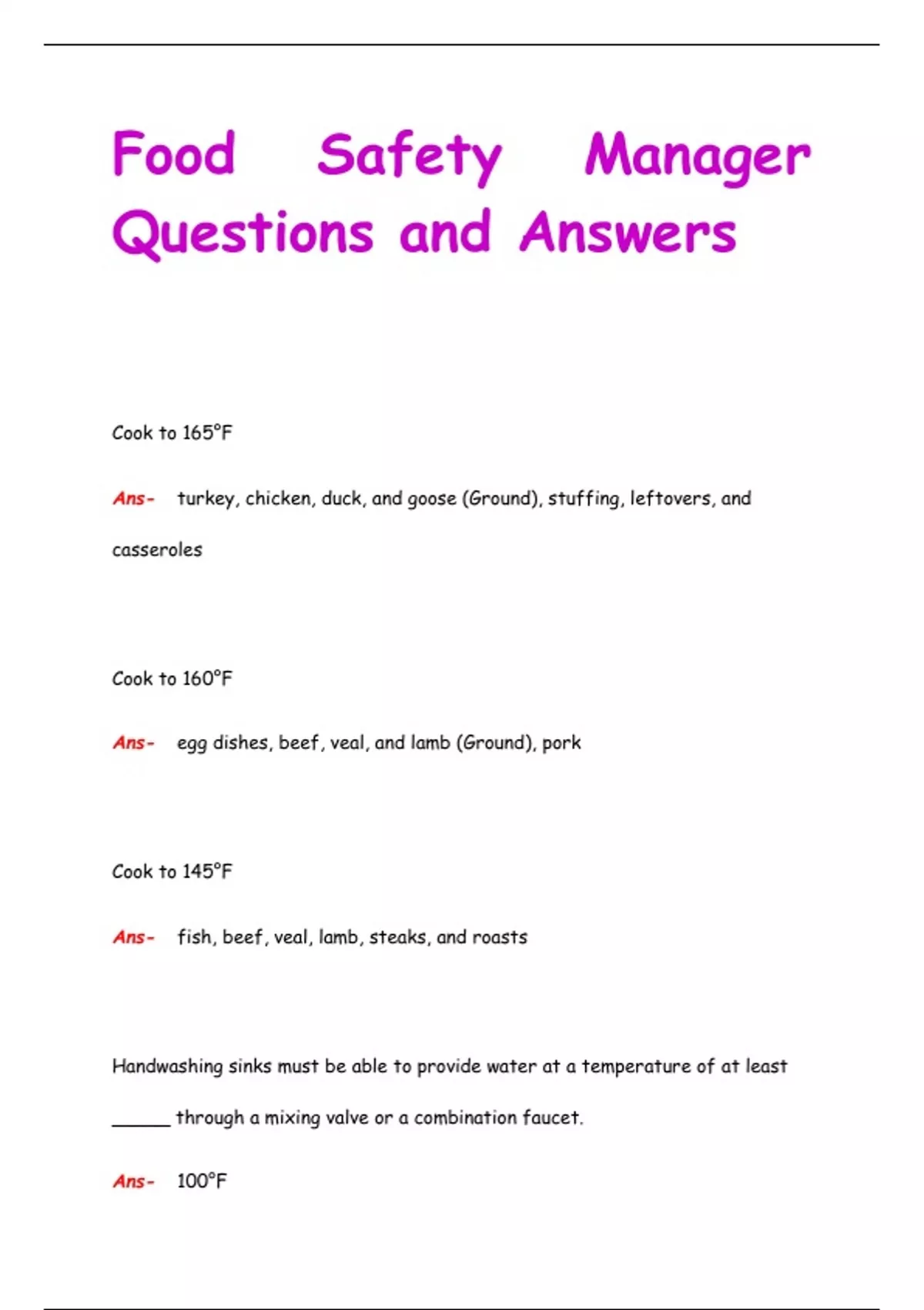 Cook to 165°F Ans- turkey, chicken, duck, and goose (Ground), stuffing, leftovers, and casseroles Cook to 160°F Ans- egg dishes, beef, veal, and lamb (Ground), pork Cook to 145°F Ans- fish, beef, veal, lamb, steaks, and roasts Handwashing sinks must be able to provide water at a temperature of at least _____ through a mixing valve or a combination faucet. Ans- 100°F Hot food on display must be held at ______ or above Ans- 135°F The internal food temperature for safe food should be ______ Ans- 130-190°F To thaw foods using the submerging method, the food must be submerged under running drinking quality water below or at _______ Ans- 70°F Canned foods must be heated to _______ Ans- 249°F Good refrigeration temperatures is ______ Ans- 34-40°F Around ______ most bacteria stop growth Ans- 41°F From the time food is served, any food that has been exposed to the temperature danger zone (41°F-135°F) for more than ______ hours must be discarded. Ans- 4 Food not intended for immediate consumption must be held at _____ or above, reheated to at least _____, rapidly cooled and refrigerated, or held at _____ or less for no longer than 2 hours (3-403.11). This is especially true for potentially hazardous food. Ans- 135°F,165°F,41°F According to the Food Code (3-403.11), cooked foods that have been cooled and will be reheated need to be heated to at least _____ for ____ or more seconds. Ans- 165°F, 1