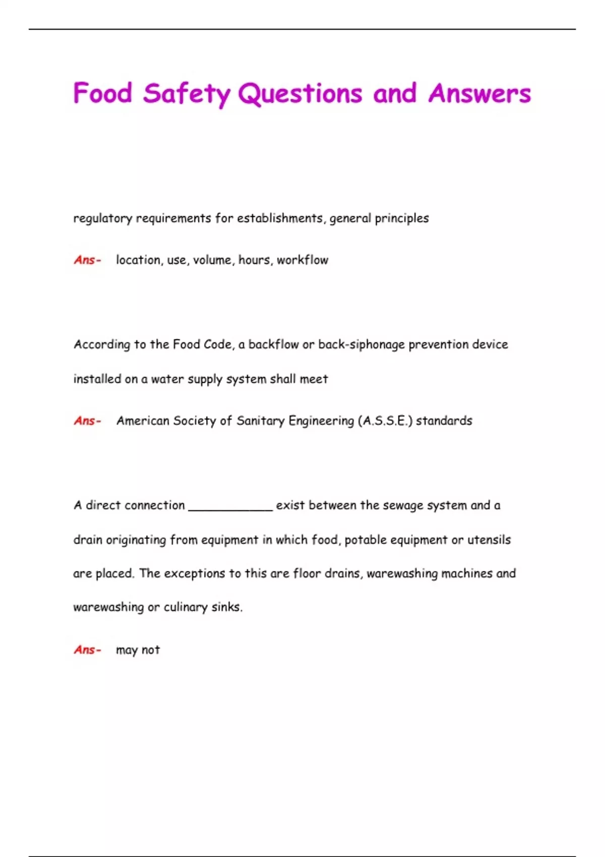 regulatory requirements for establishments, general principles Ans- location, use, volume, hours, workflow According to the Food Code, a backflow or back-siphonage prevention device installed on a water supply system shall meet Ans- American Society of Sanitary Engineering (A.S.S.E.) standards A direct connection ___________ exist between the sewage system and a drain originating from equipment in which food, potable equipment or utensils are placed. The exceptions to this are floor drains, warewashing machines and warewashing or culinary sinks. Ans- may not _______________ is a suitable material to use. Maple and similar closegrained hardwoods are the only Food Code-approved woods for cutting boards, cutting blocks, and pizza paddles Ans- Stainless steel Floors may be made of such things as Ans- vinyl, ceramic tile, and welded anti-slip. When water service has been interrupted for at least _______or more, you are experiencing an extended interruption of water service. Ans- two hours water loss Ans- make note of time and date, inform authority, proper emergency steps (or close), discontinue if needed, in case of water interruptio
